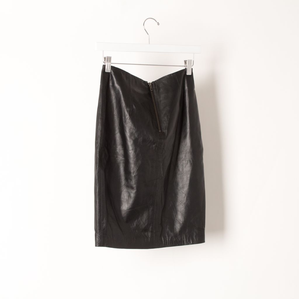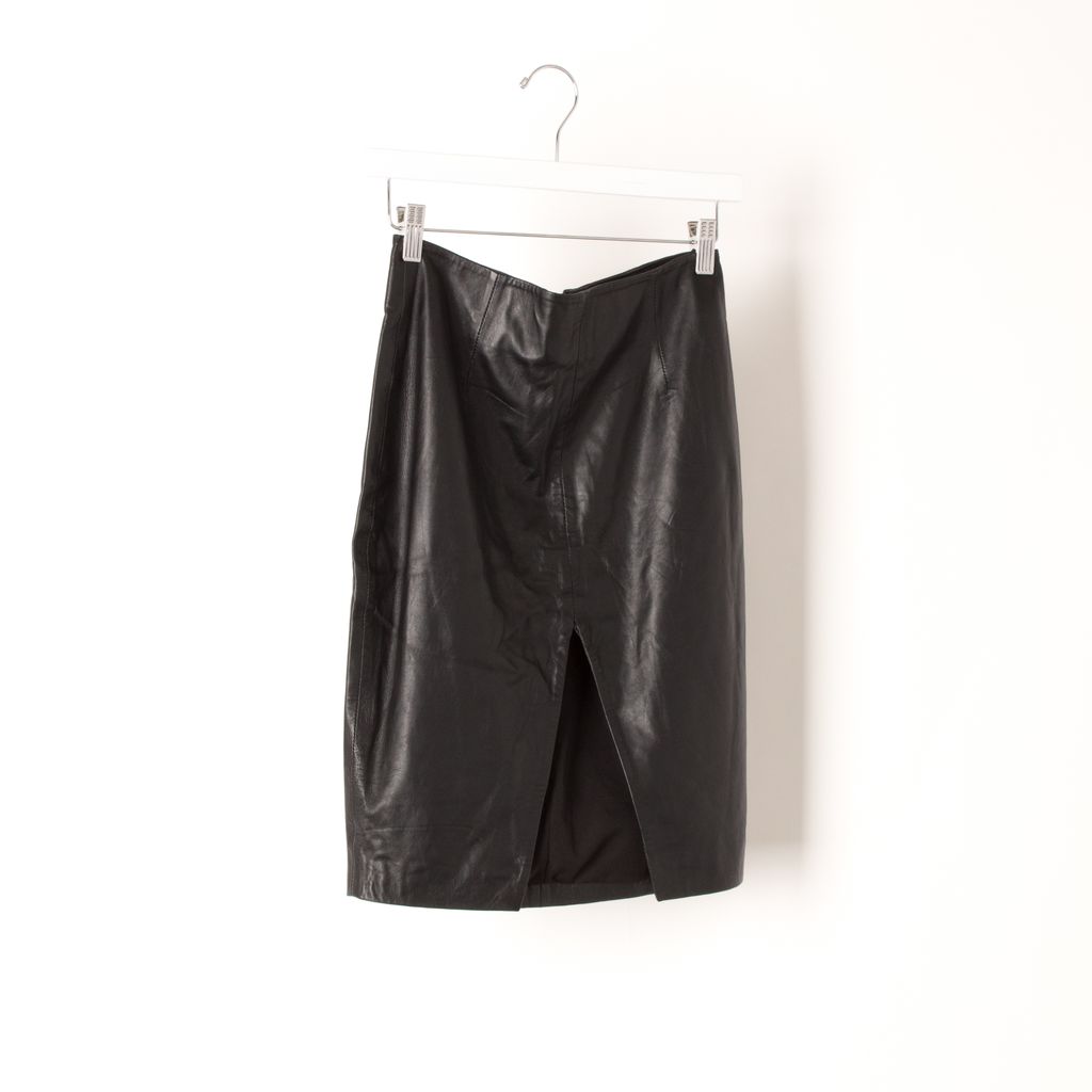 Brand new with tags, leather skirt from Jaggar. 100% leather, lined in polyester. The skirt has a wedge split feature at the front, a mid-rise fitted style, with a to-the-knee length.