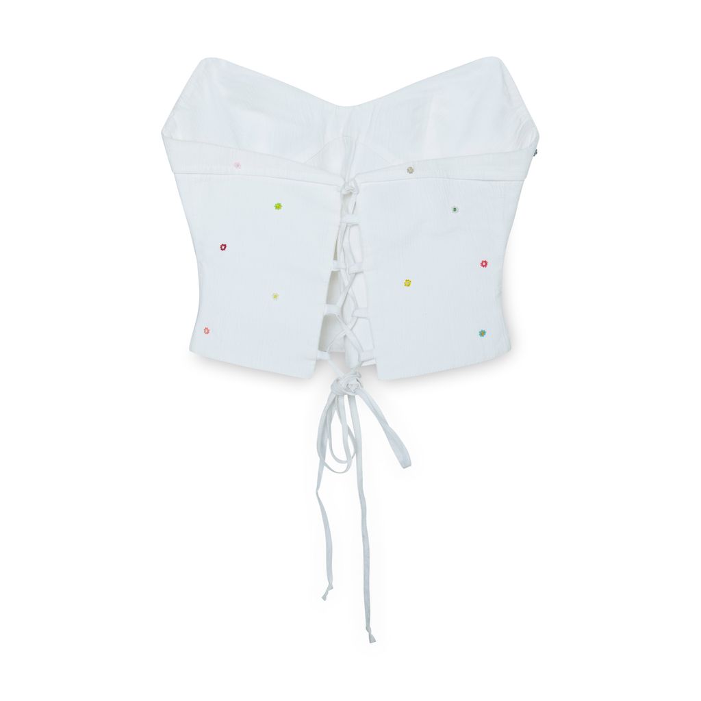 J.A.M Studios Beaded Flower Strapless Top features multicolor mini beaded flowers, lace up back, and cropped fit.