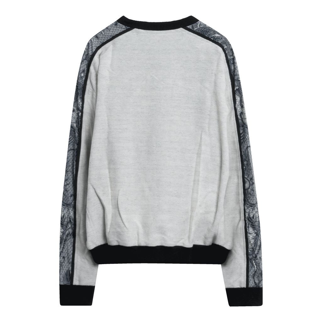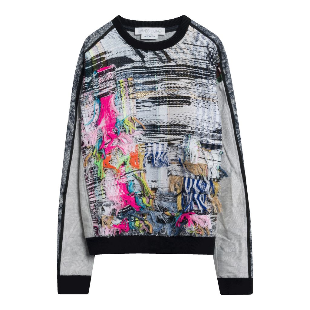 Can't decide on a color for your outfit? Why not wear them all with this knit pullover from James Long! Features all over multicolored knit and fringe detail, contrast pattern stripes down arms, and contrast colored rib knit bands at neck, wrists, and waist.