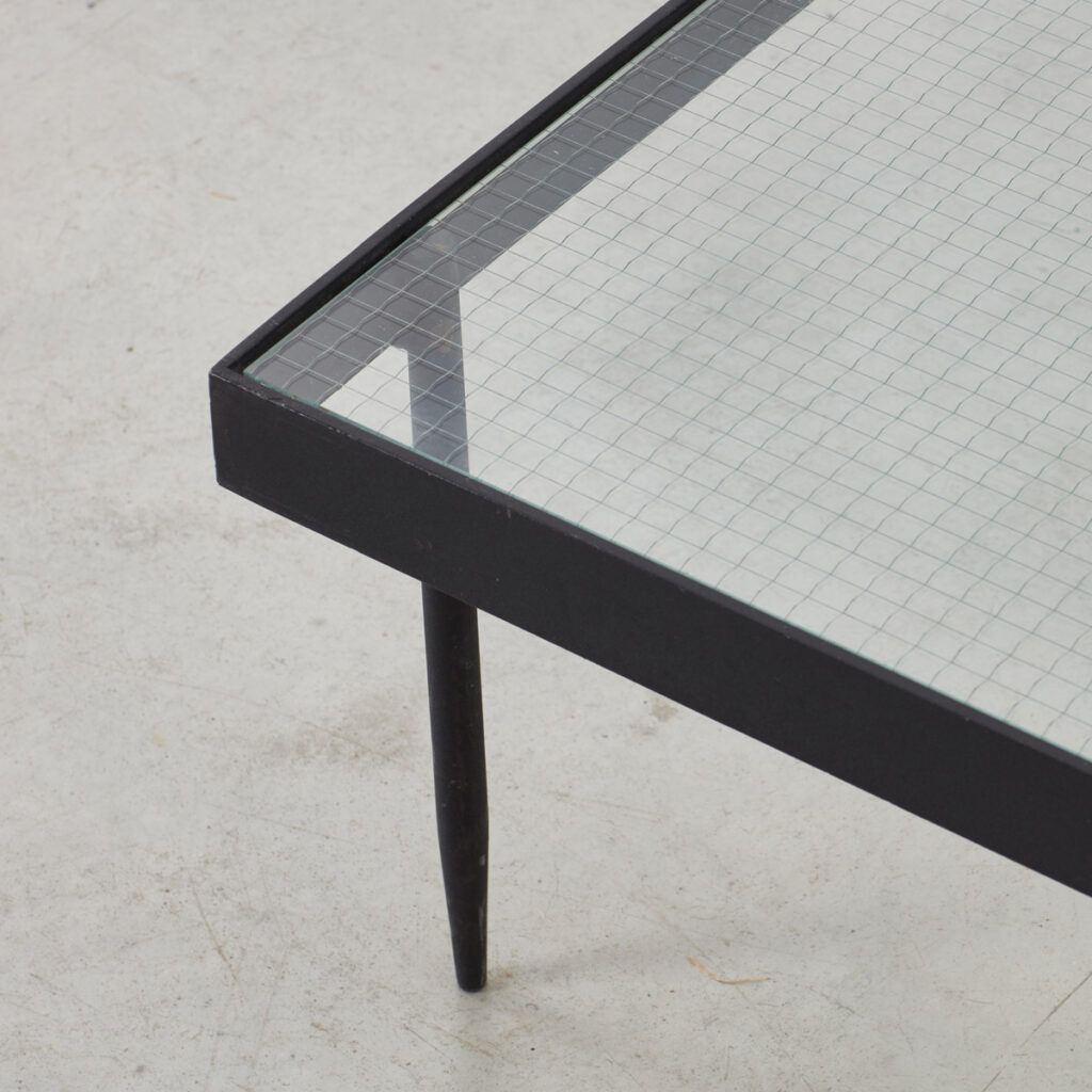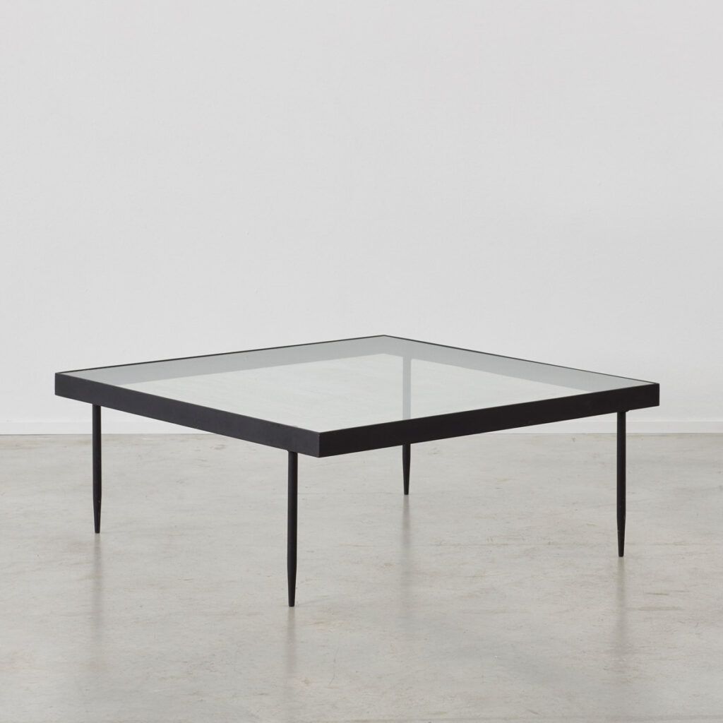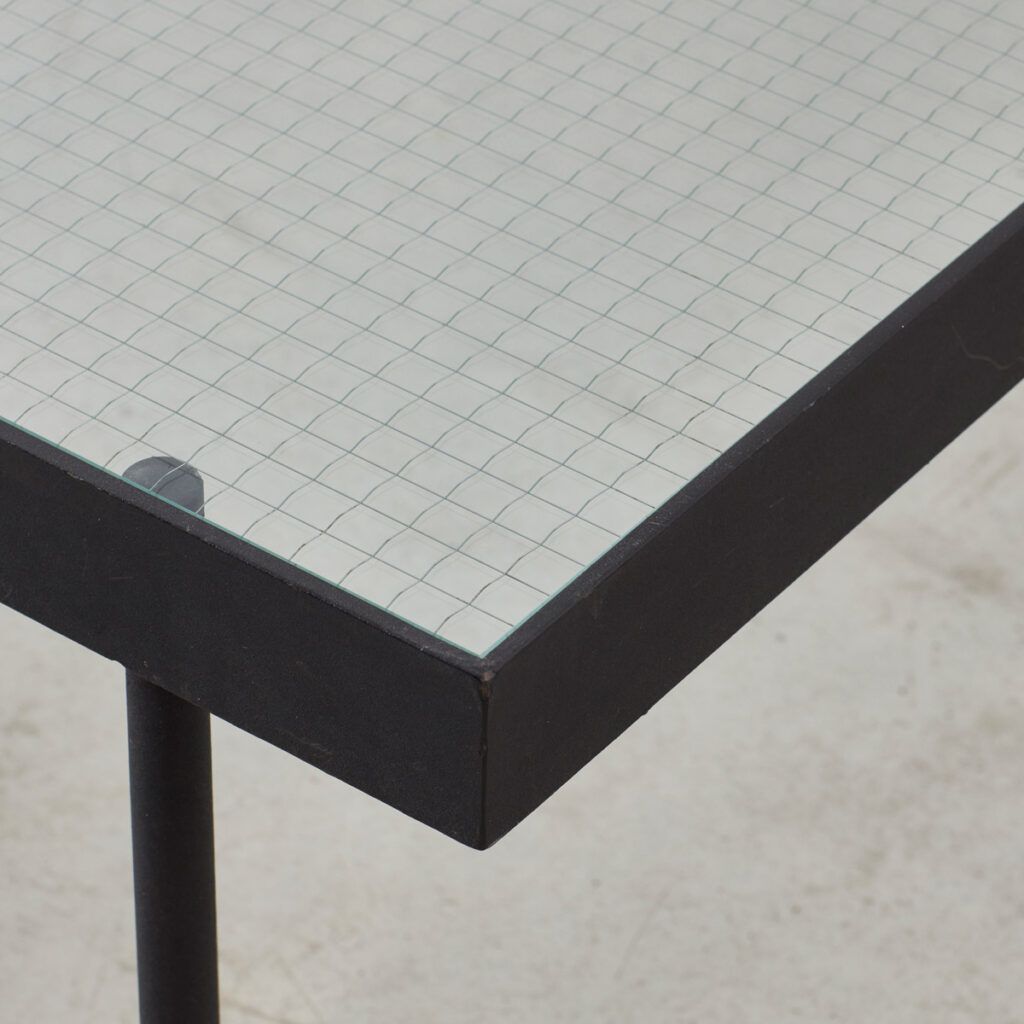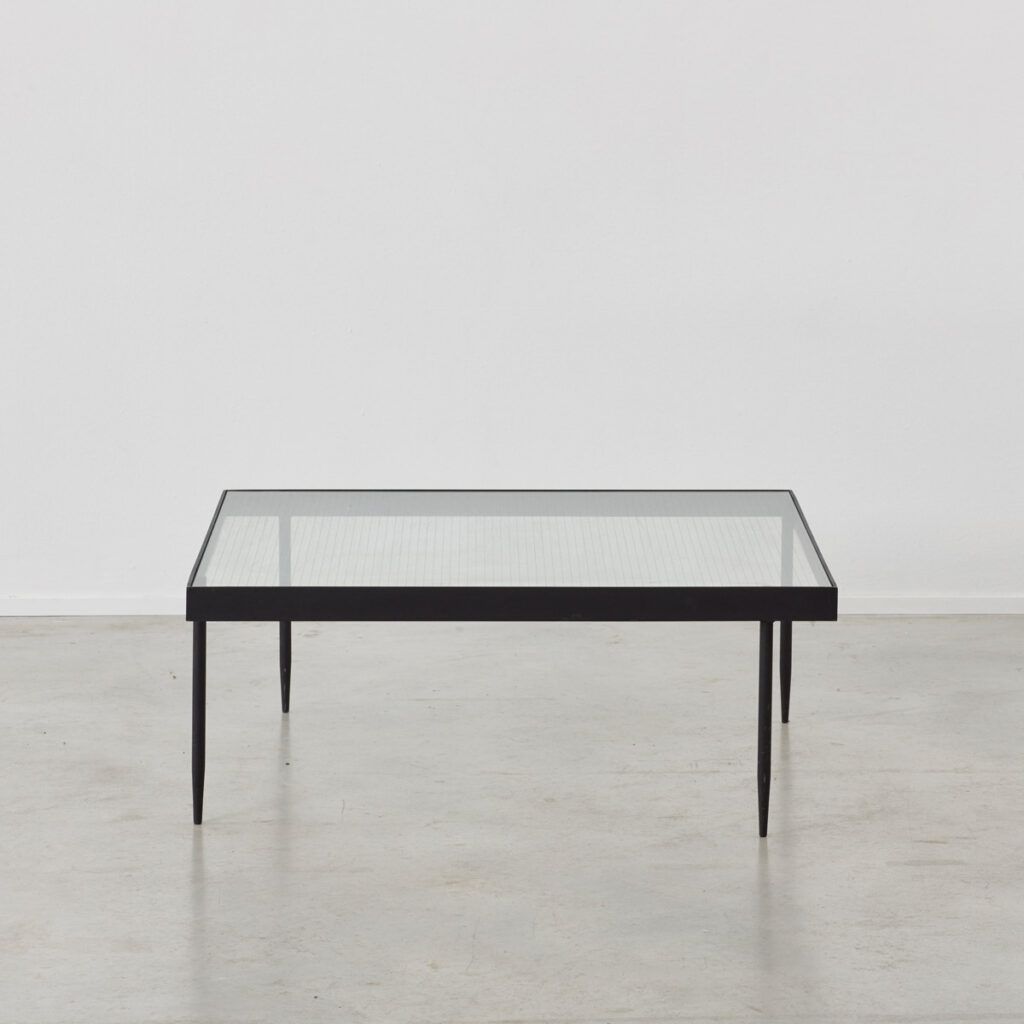 The almost singular focus of Dutch designer Janni van Pelt (b.1921) centred on a limited and thus rare series of tables in steel and reinforced glass. This square wired glass variation, which sits on delicate cylindrical tapered legs, evokes a functionalism born of the Bauhaus.