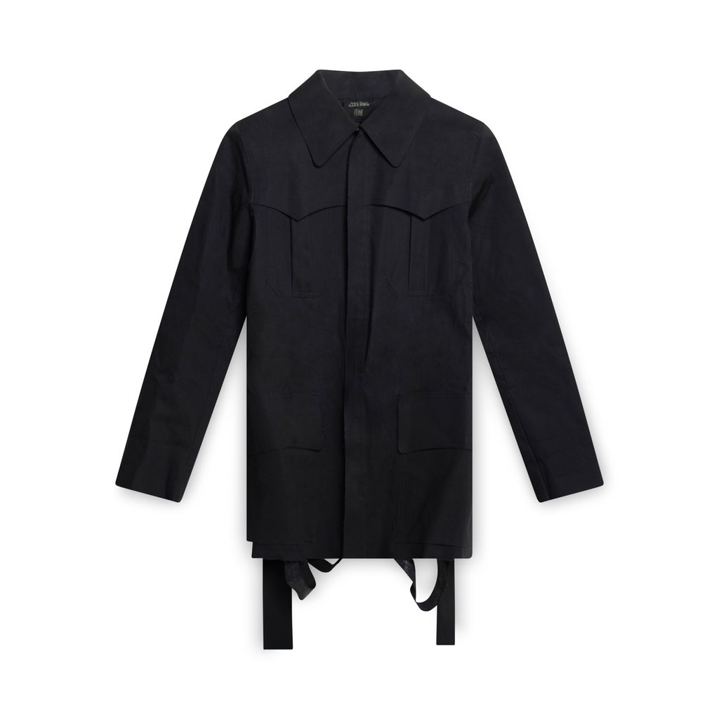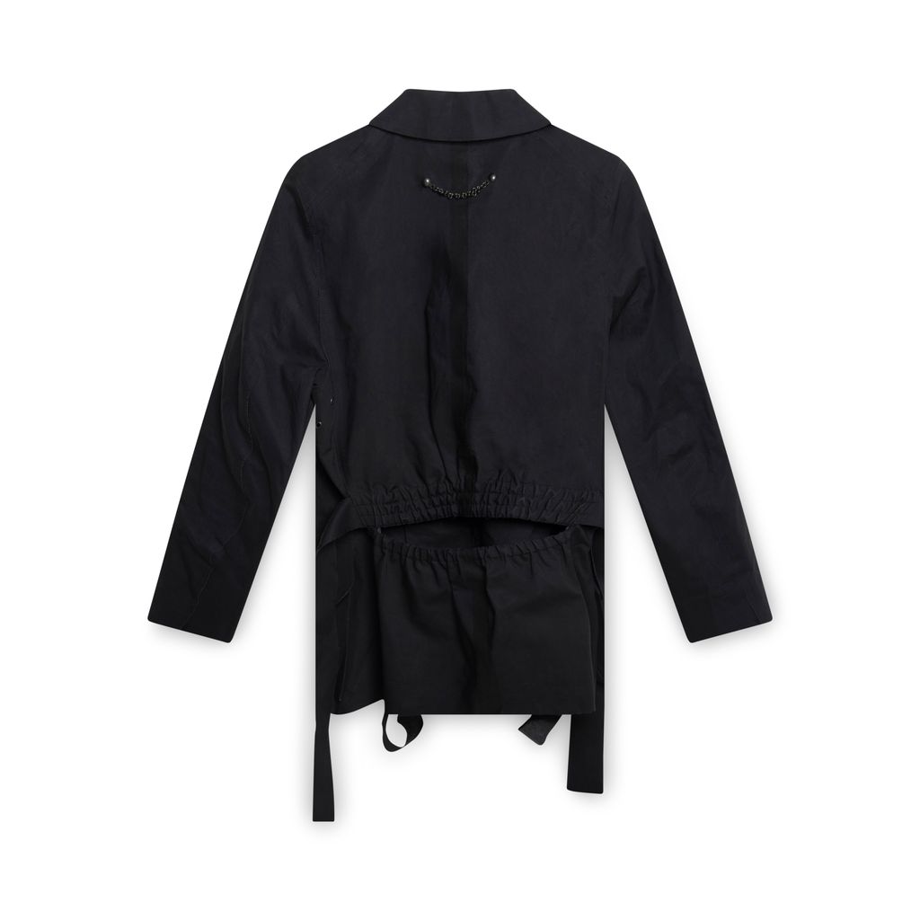 Jean Paul Gaultier Black Cut Out Trench features front zip closure, attached belt, 4 pockets on front, and cut out in back with elastication.