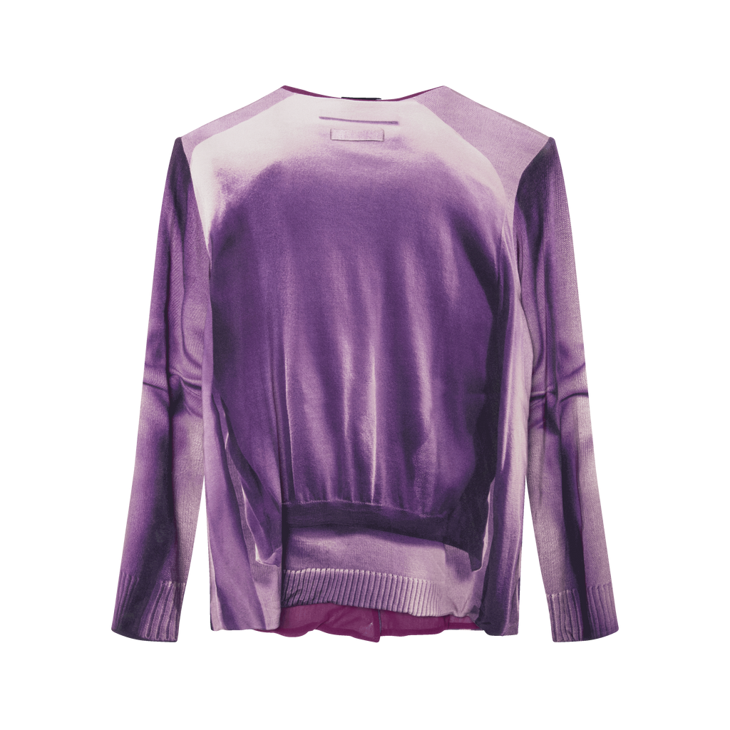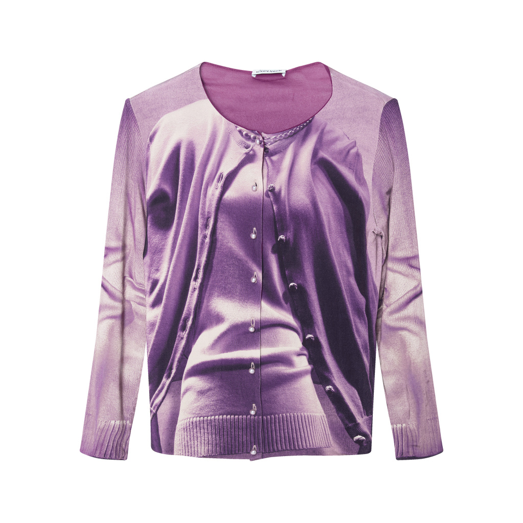 Jean Paul Gaultier Purple Twin Set Cardigan features long sleeve stretch viscose, graphic printed in tones of purple, front button closure, locker loop at back, and tonal tulle lining.
