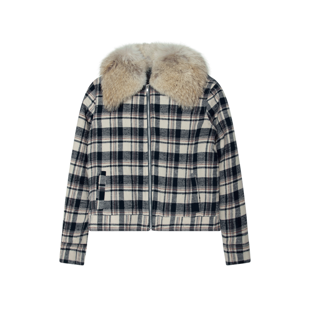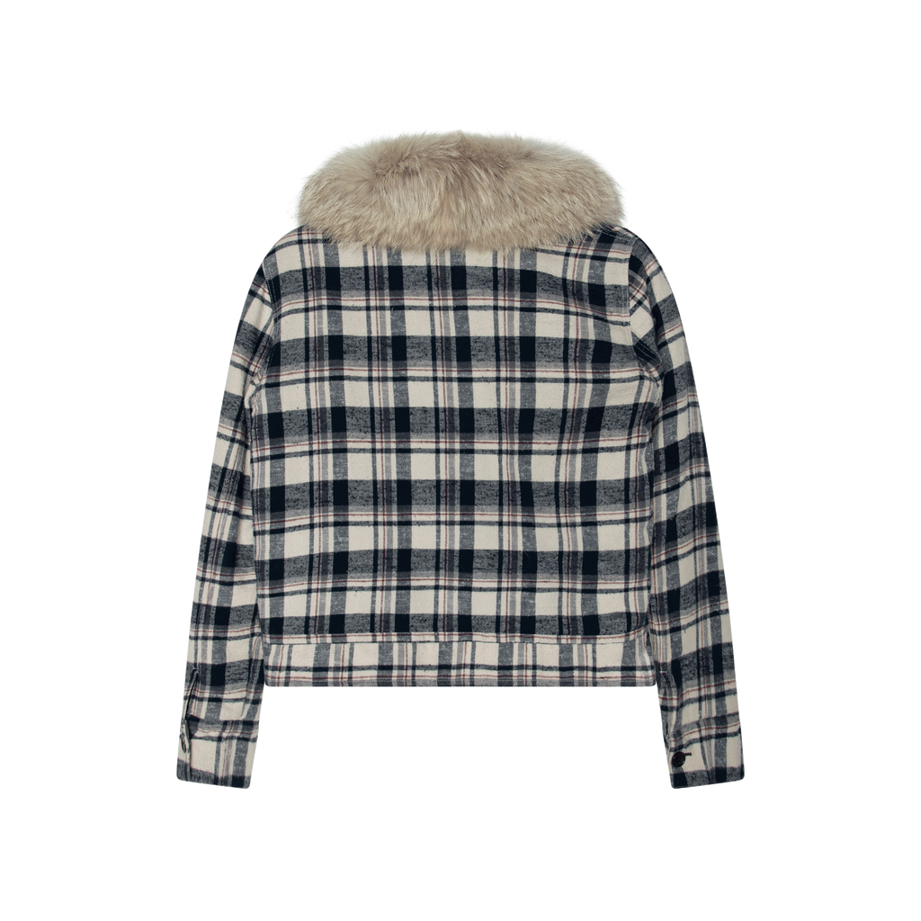 Jenni Kayne Checkered Shearling Jacket features quilted lining, plaid pattern, front zip closure, welt front pockets, and button cuffs.