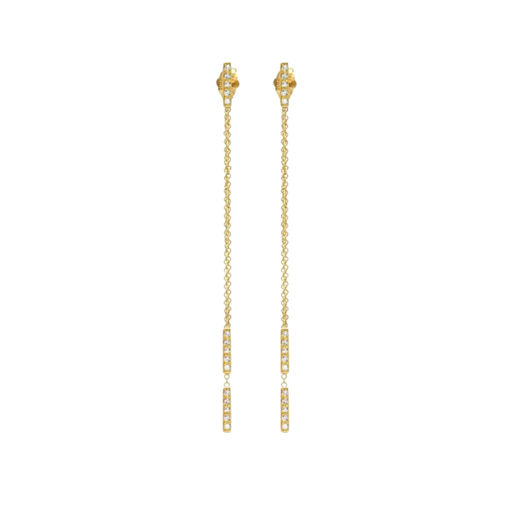 Delicate and effortlessly chic , Jennifer Meyer's Diamond Threaded Bar Studs are handcrafted in 18k yellow gold set with shimmering pave diamonds that hang from both the front and the back of the lobe. Wear yours to complement any look , day or night. Post backing , measures 2.5" in length , sold as a pair.