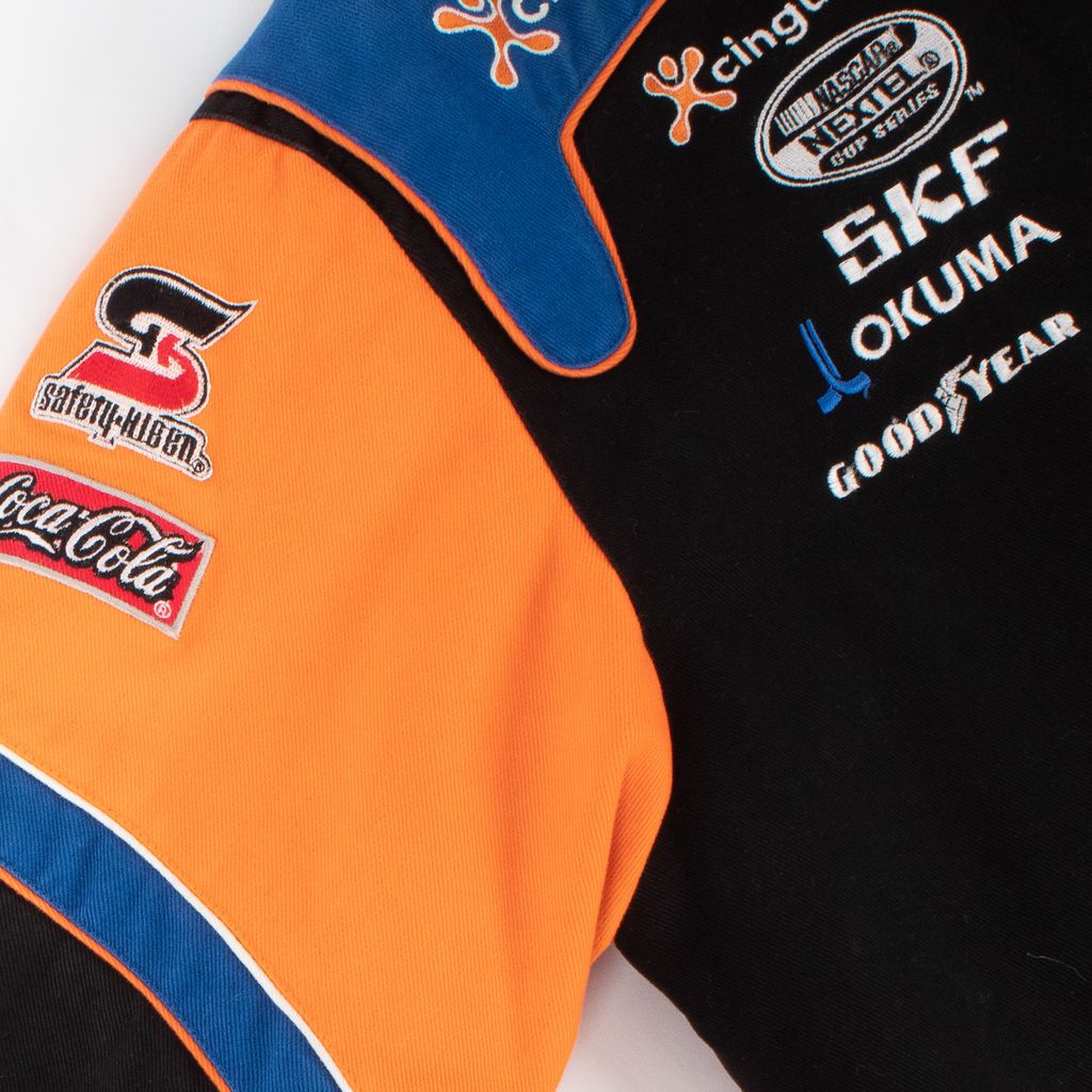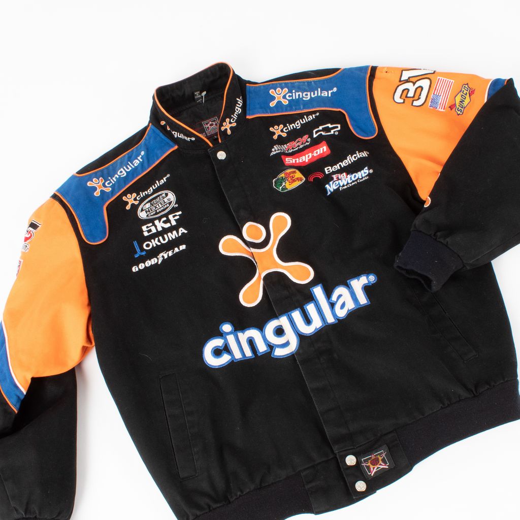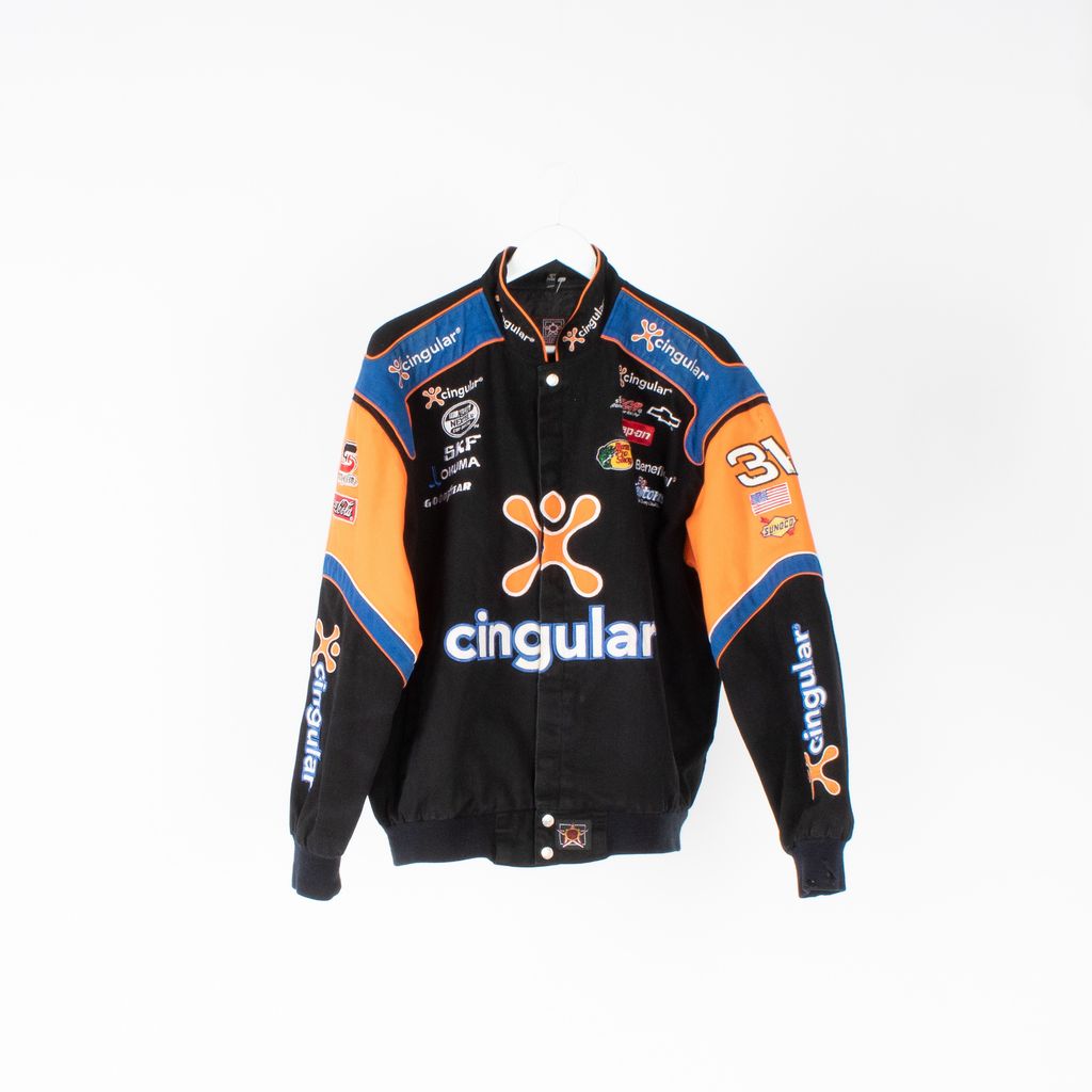 Rev up your engines and get ready to roll in this sick racing jacket from JH Design. Features snap button front, all over embroidery from corporate sponsors, slanted front pockets, and minor signs of wear. Signs of wear include color fading, and signs of distressing throughout.