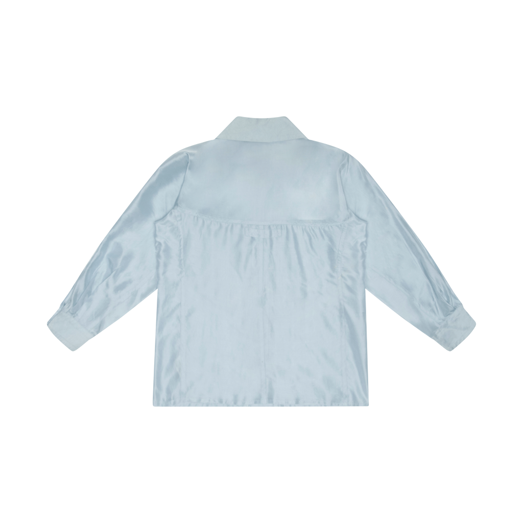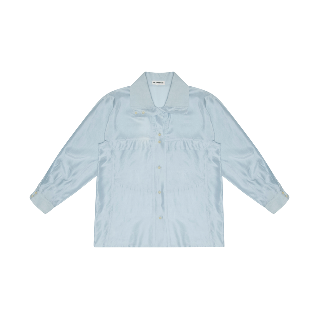Jil Sander Blue Silk Button Up features front button closure, raglan sleeves, 2 chest pockets, and loose fit.