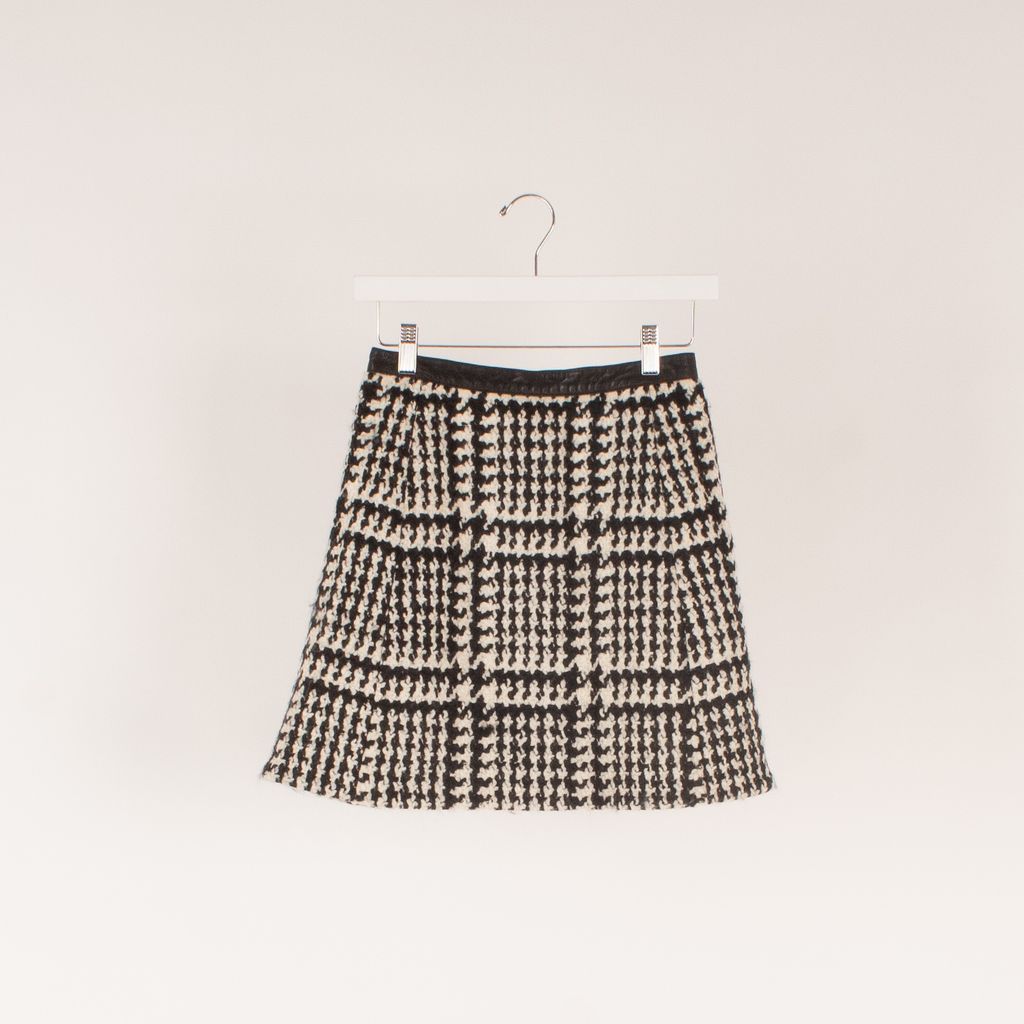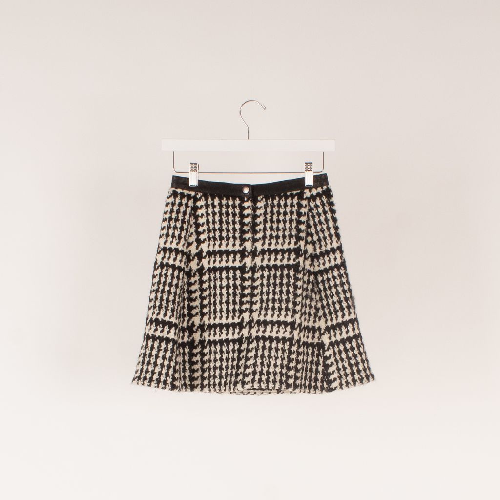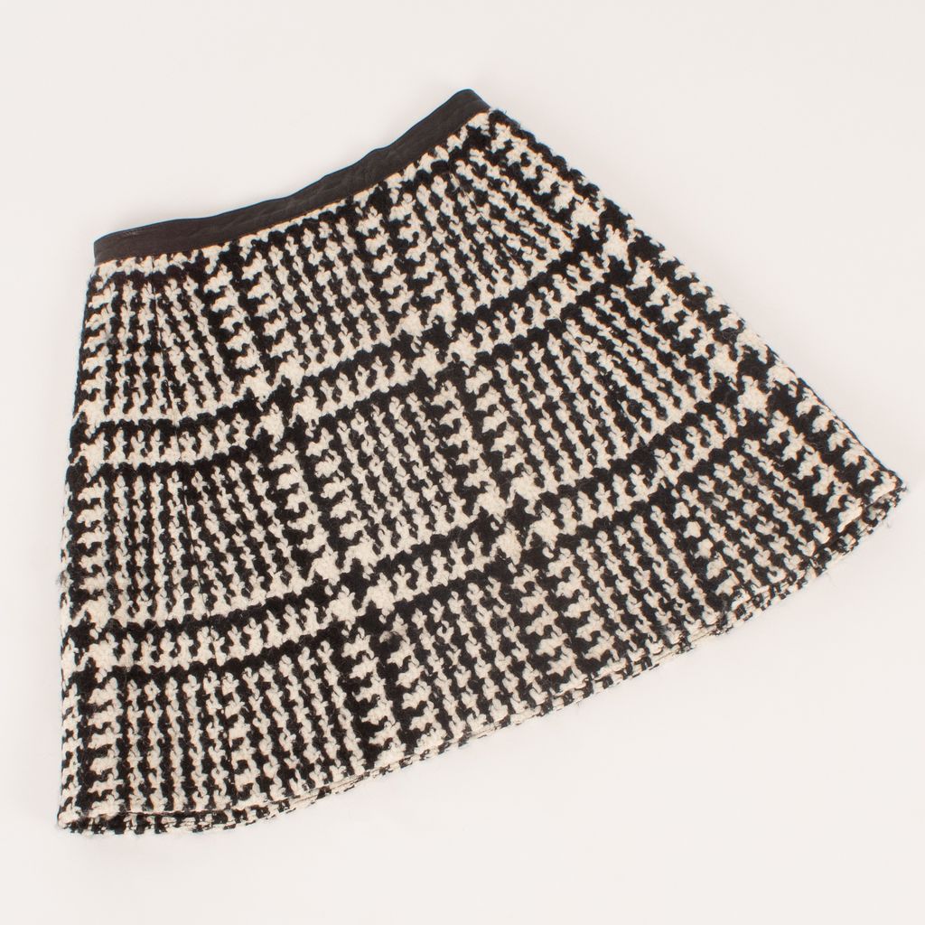 This Jill Stuart skirt gives off major Mad Men vibes with its beautiful houndstooth pattern and flared out circle shape. Pair with your favorite silk blouse to channel your inner Peggy Olson. Features all over knit houndstooth pattern, invisible zipper and snap back closure, leather trimmed waistband, and full lining.