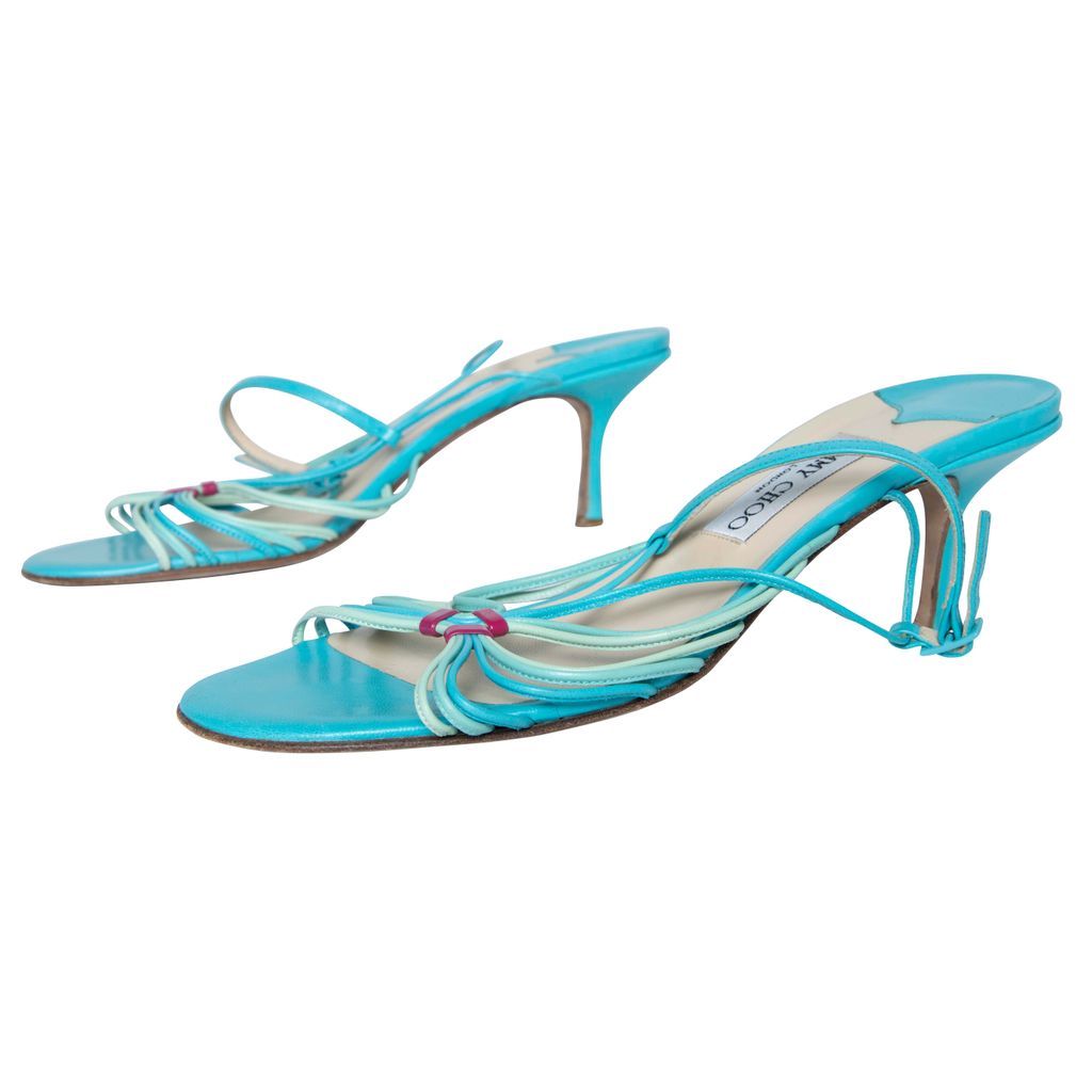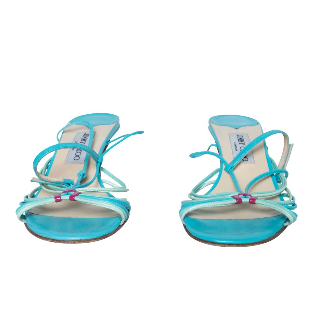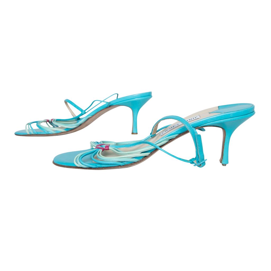 Jimmy Choo Blue Strappy Kitten Heels features adjustable slingback, open toe, and blue and green strappy detailing.