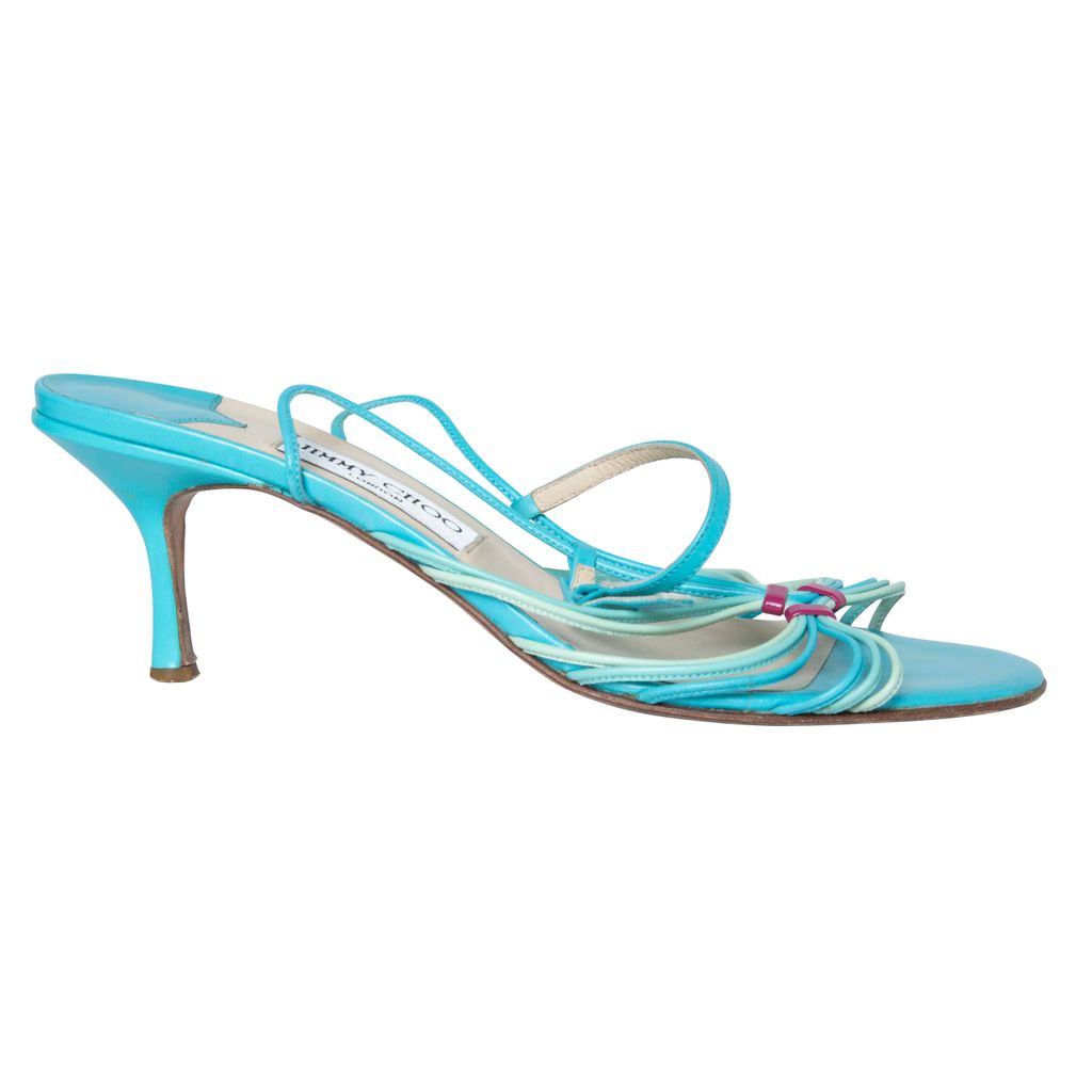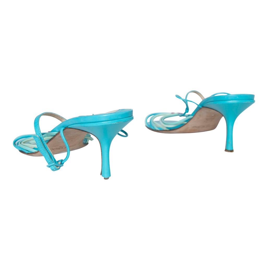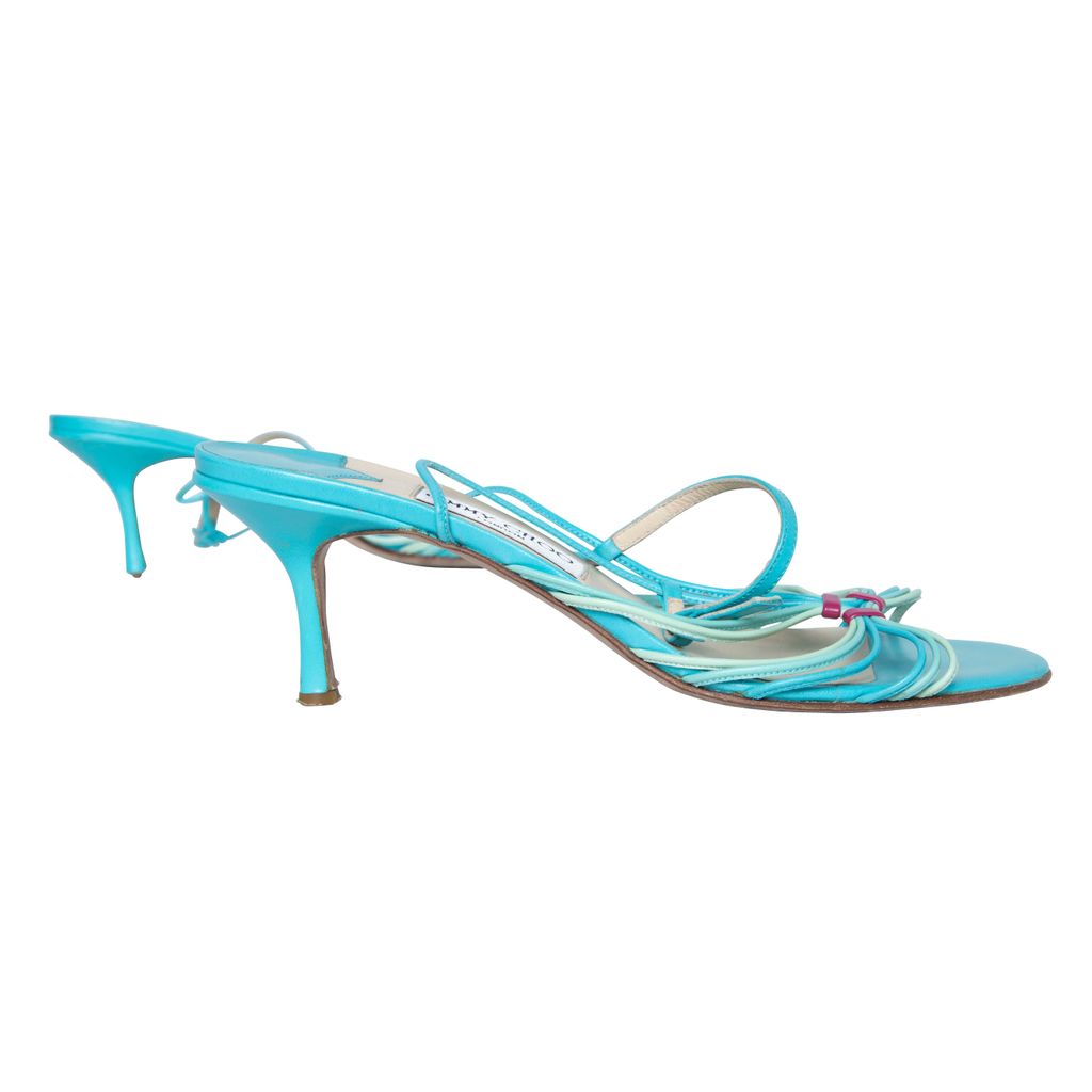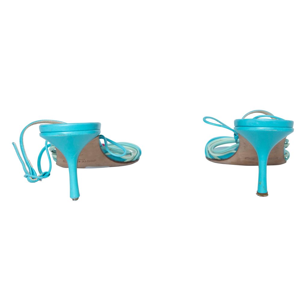 Jimmy Choo Blue Strappy Kitten Heels features adjustable slingback, open toe, and blue and green strappy detailing.