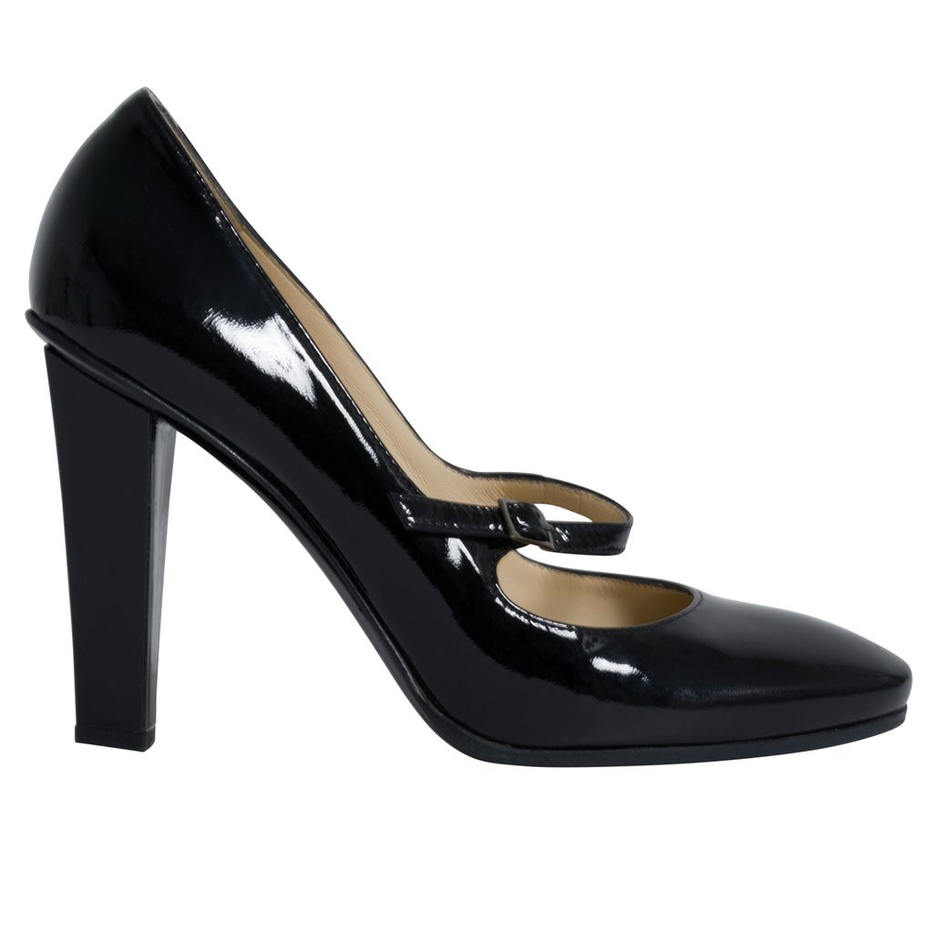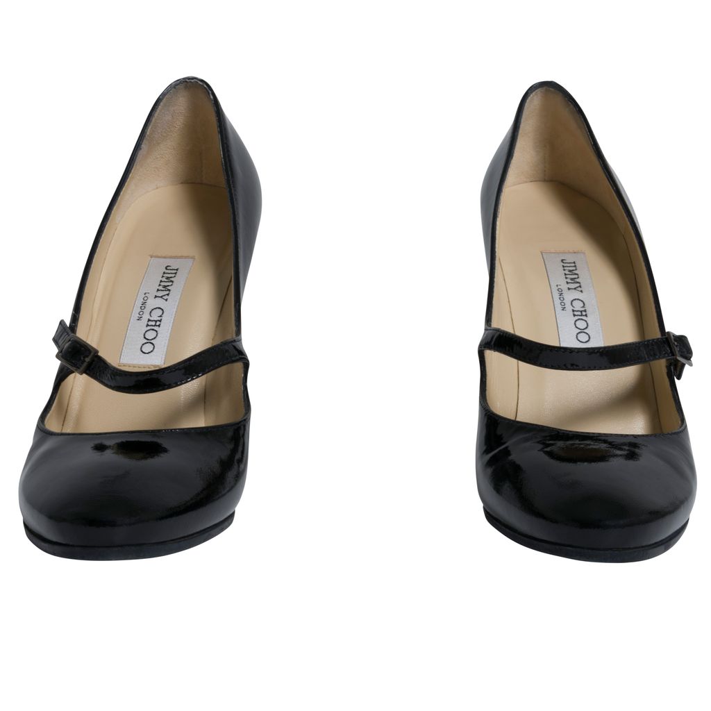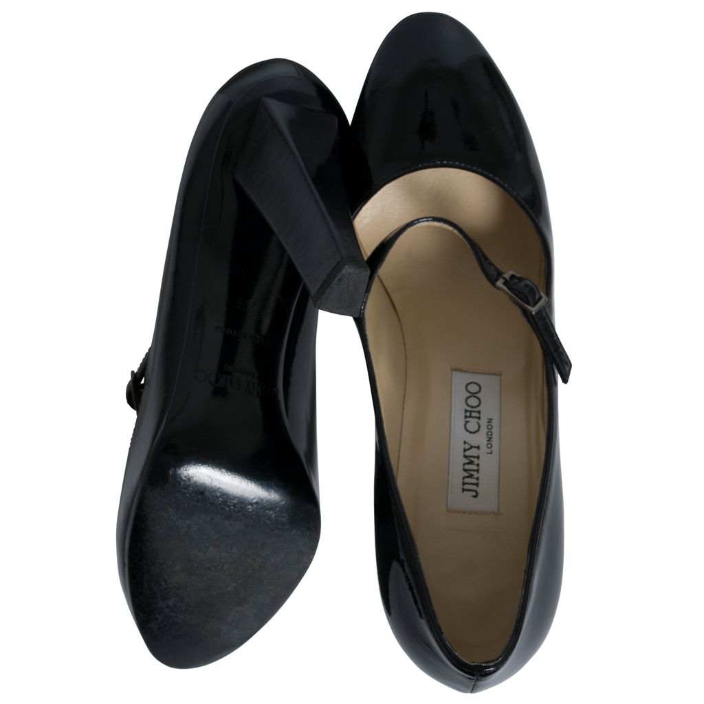 These black patent leather mary-jane pumps from Jimmy Choo are a shoe wardrobe staple- featuring an almond toe, inset square heel and arch strap with buckle fastening. Italian sizing. This style runs a half size small. In excellent condition. Minor scuffing at the sole. Comes with original box.