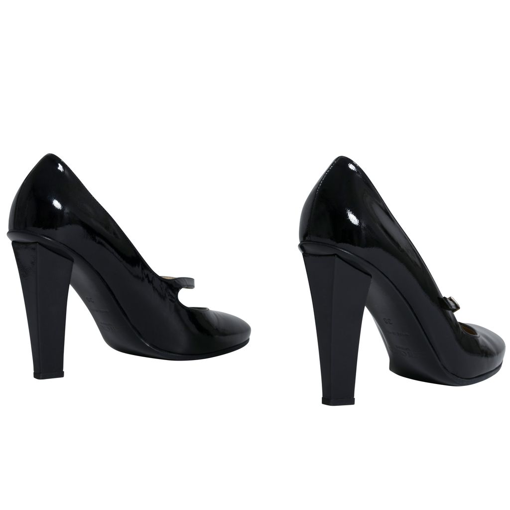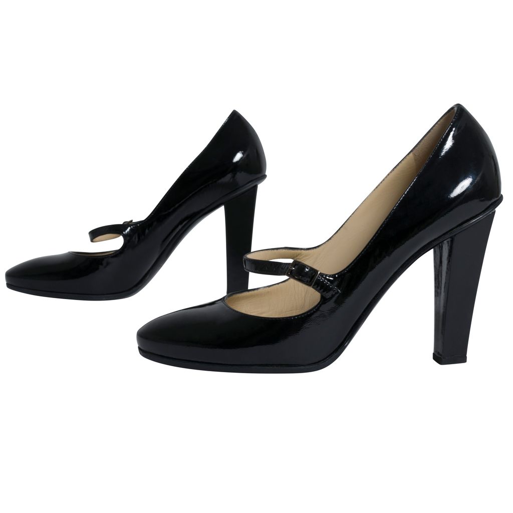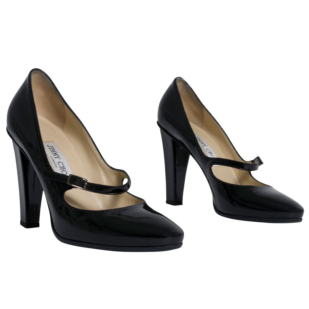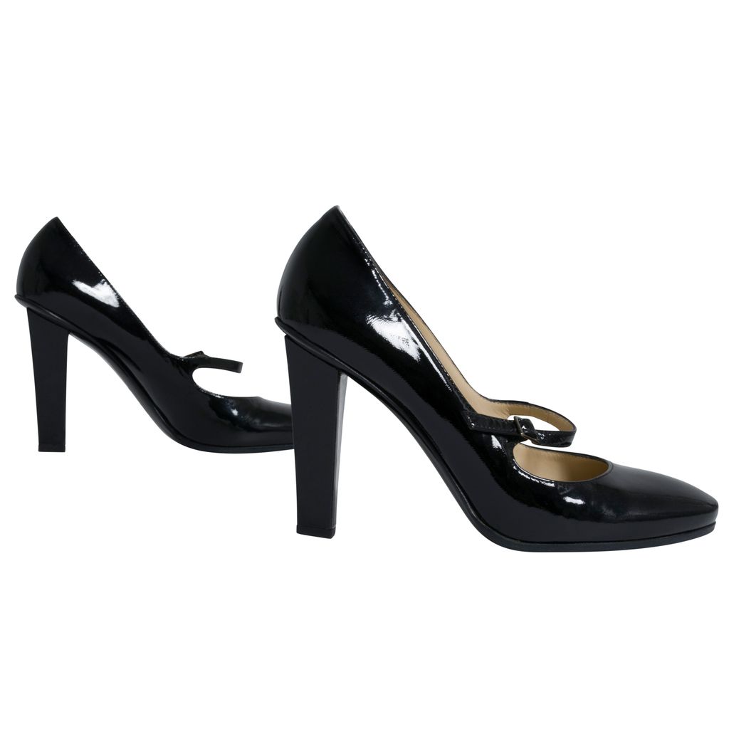 These black patent leather mary-jane pumps from Jimmy Choo are a shoe wardrobe staple- featuring an almond toe, inset square heel and arch strap with buckle fastening. Italian sizing. This style runs a half size small. In excellent condition. Minor scuffing at the sole. Comes with original box.
