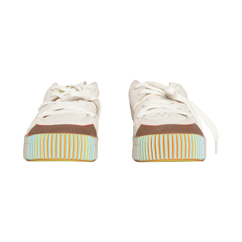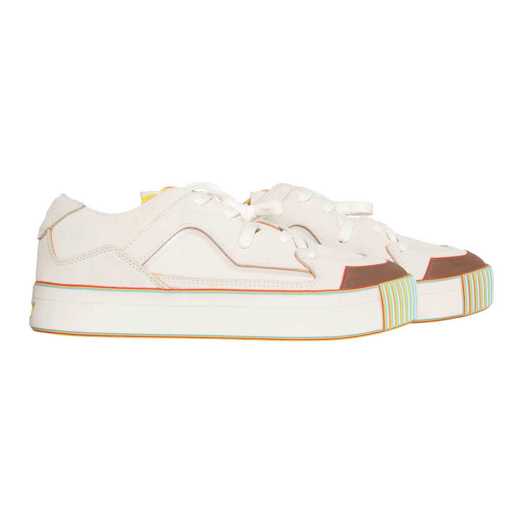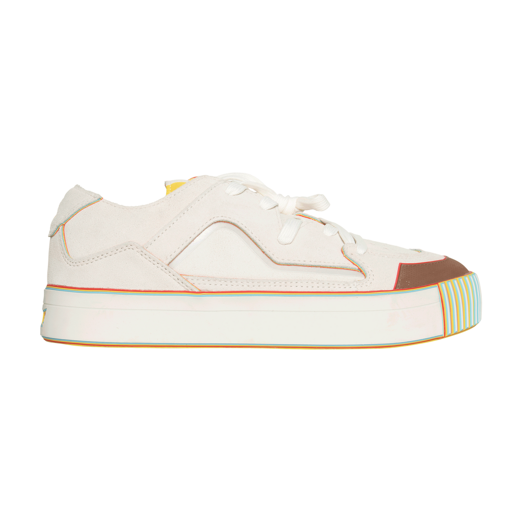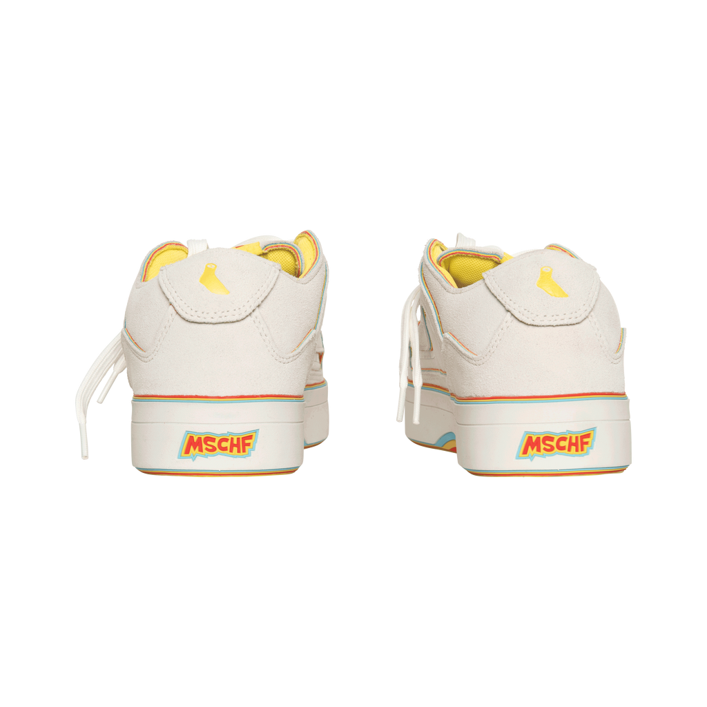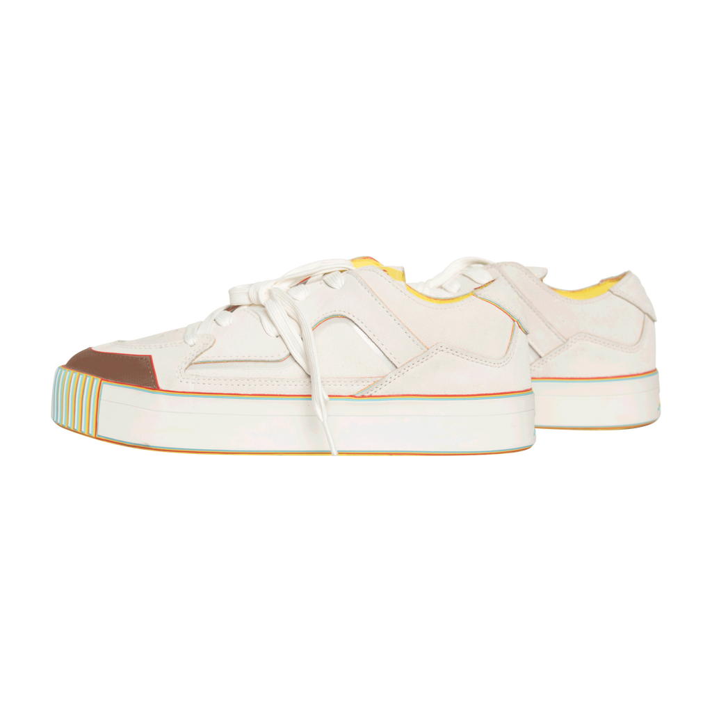 Jimmy Fallon x MSCHF Gobstomper Sneaker features low top, neutral off-white finish throughout uppers and midsole, branding on tongue tag, dismembered foot logo on heel tab, and wears away to reveal 4 layers of multi-colored material.