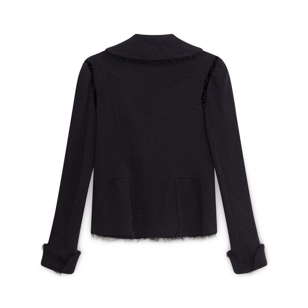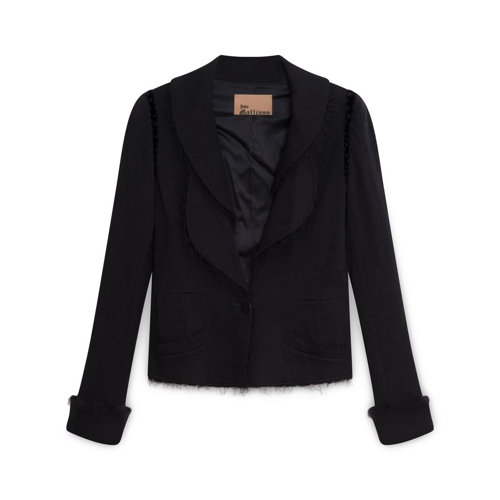John Galliano Wool Blazer features raw edge double collar, button closure, two front pockets, velvet trim around arms, cuffed sleeves.