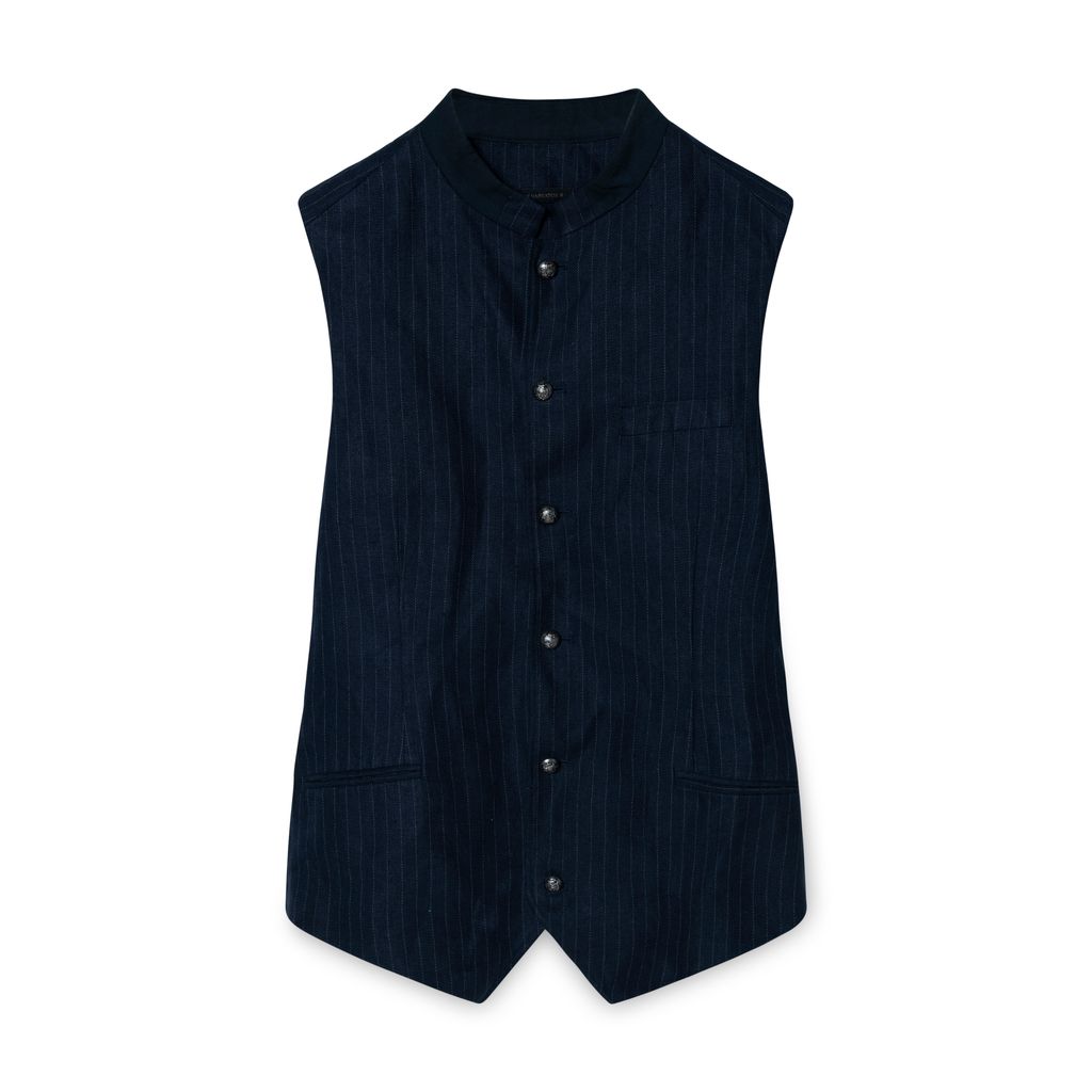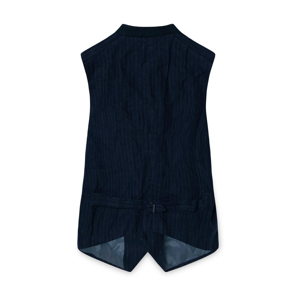 John Varvatos Vest features stripe detail, front pockets, front button closure with gun metal buttons, and adjustable strap in the back.
