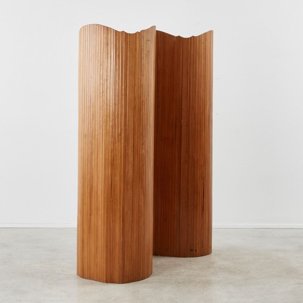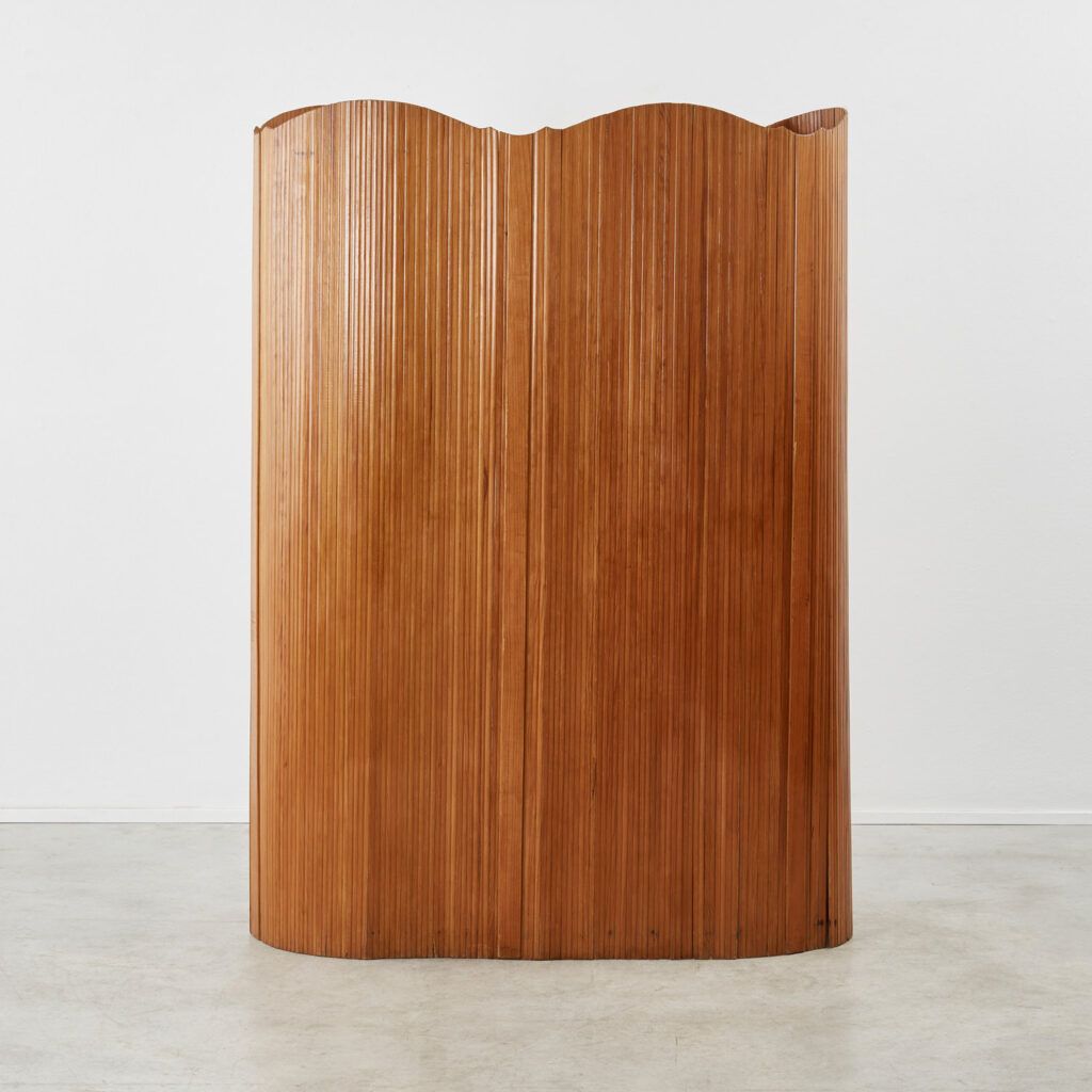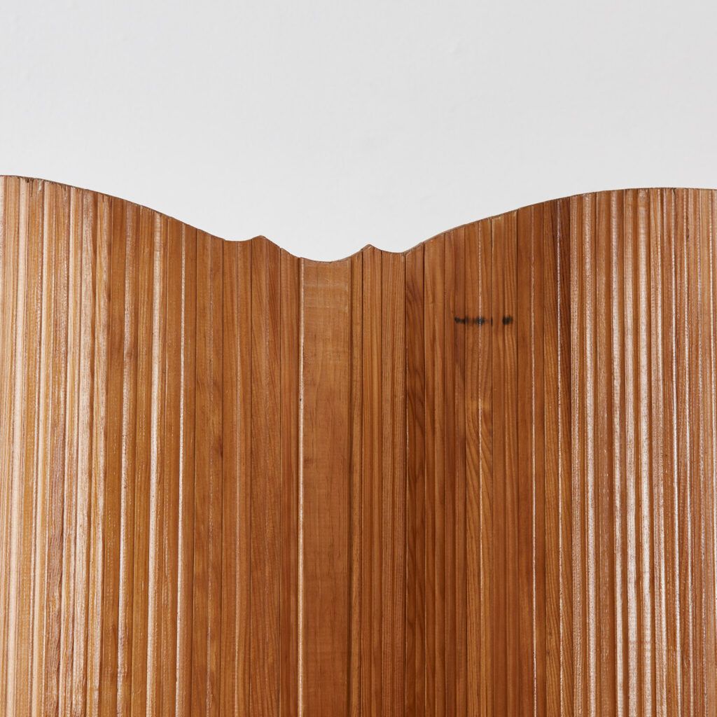 This twentieth-century Art Deco screen strongly recalls the hand of French designer Jomain Baumann. Its pine slats are stained and polished, and the flexibility of the joints – which are capable of unfurling in several configurations – is made possible by an invisible articulated system.