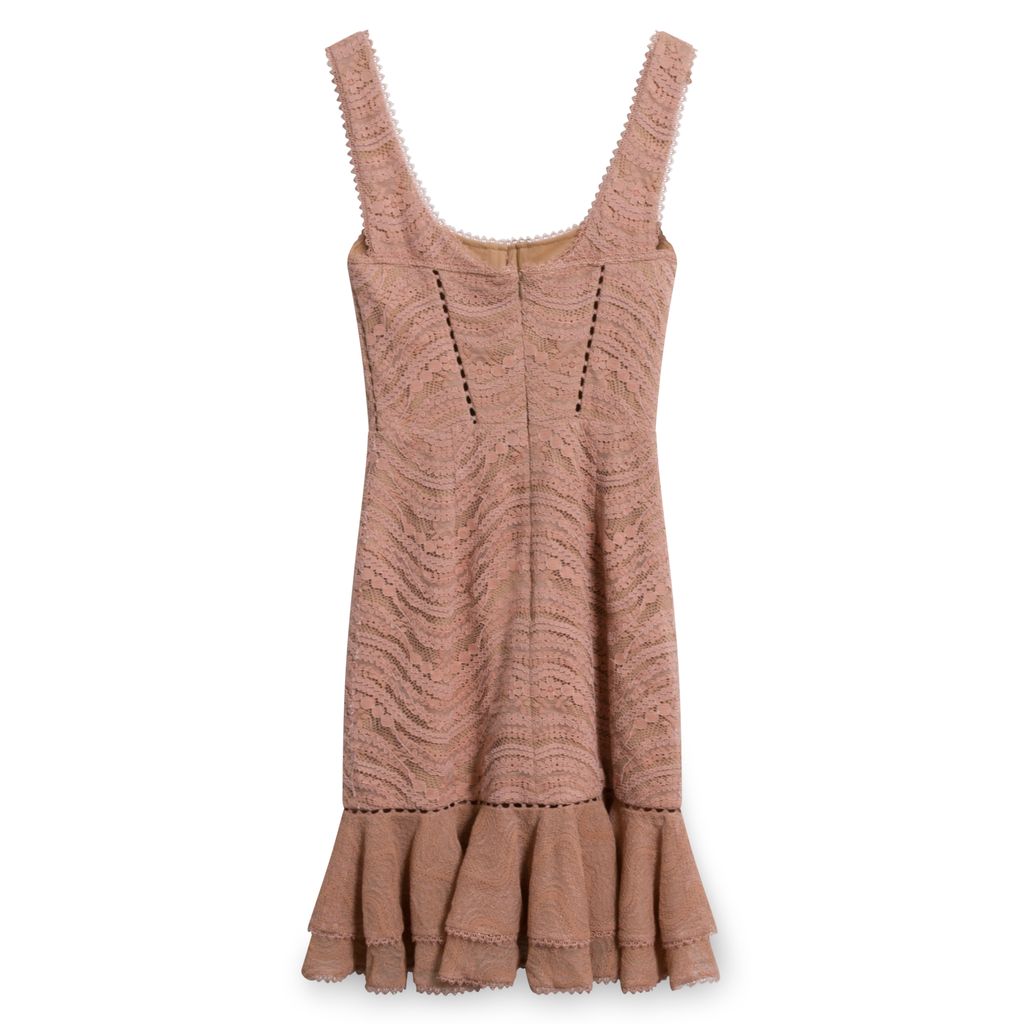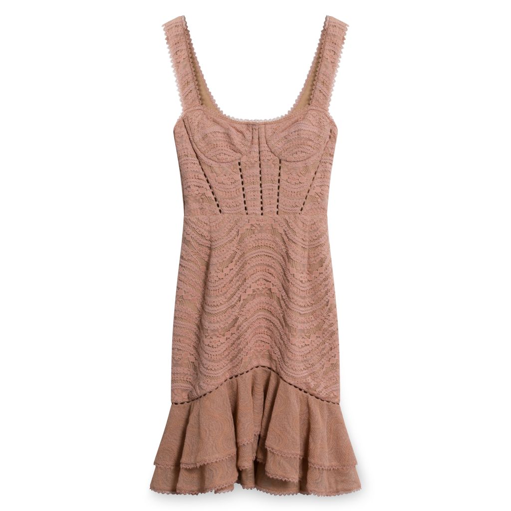 This bustier mini dress from Jonathan Simkhai is made from a textured fabrication and features a fit and flare silhouette with tiered ruffle hem, seamed bodice, and concealed back zip closure with hook and eye clasp. Lined. In good condition.