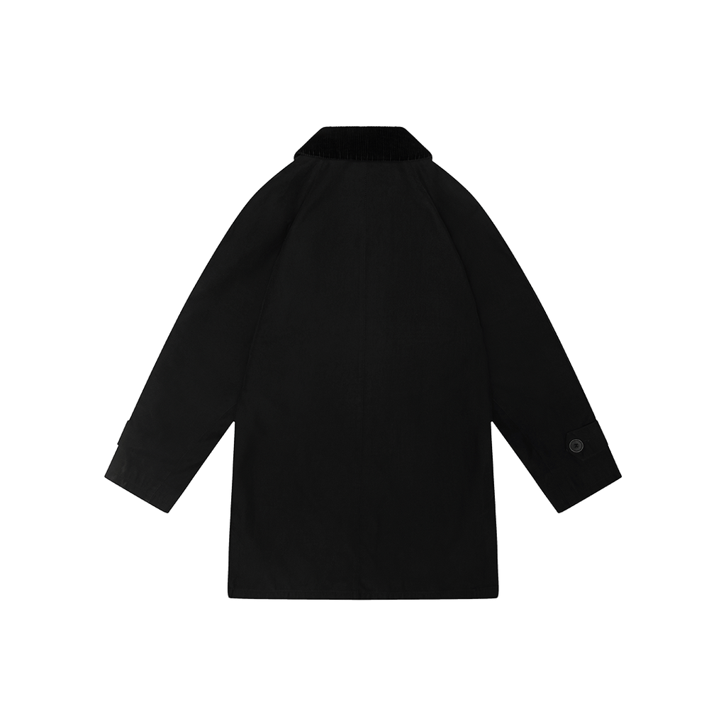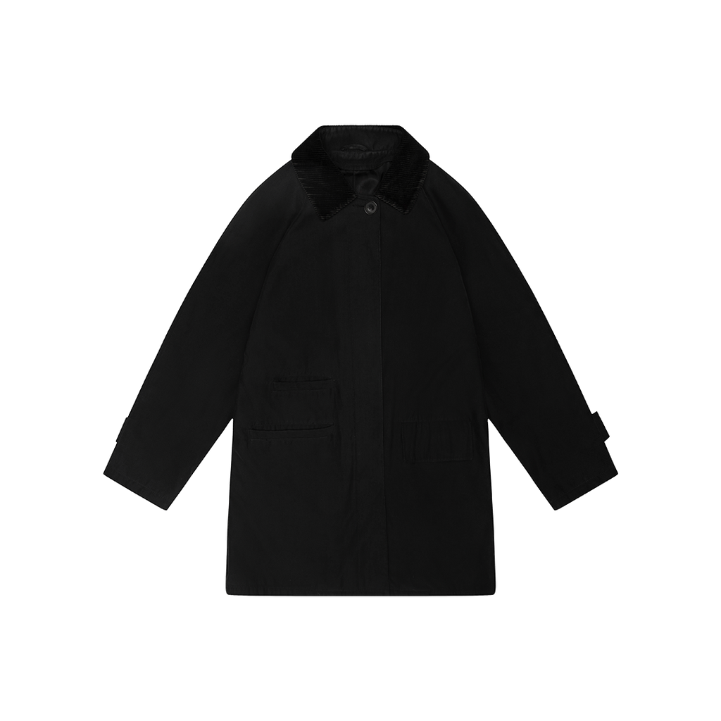 Jones New York Black Chore Jacket features front button closure, black corduroy collar, 3 pockets, and raglan sleeves.