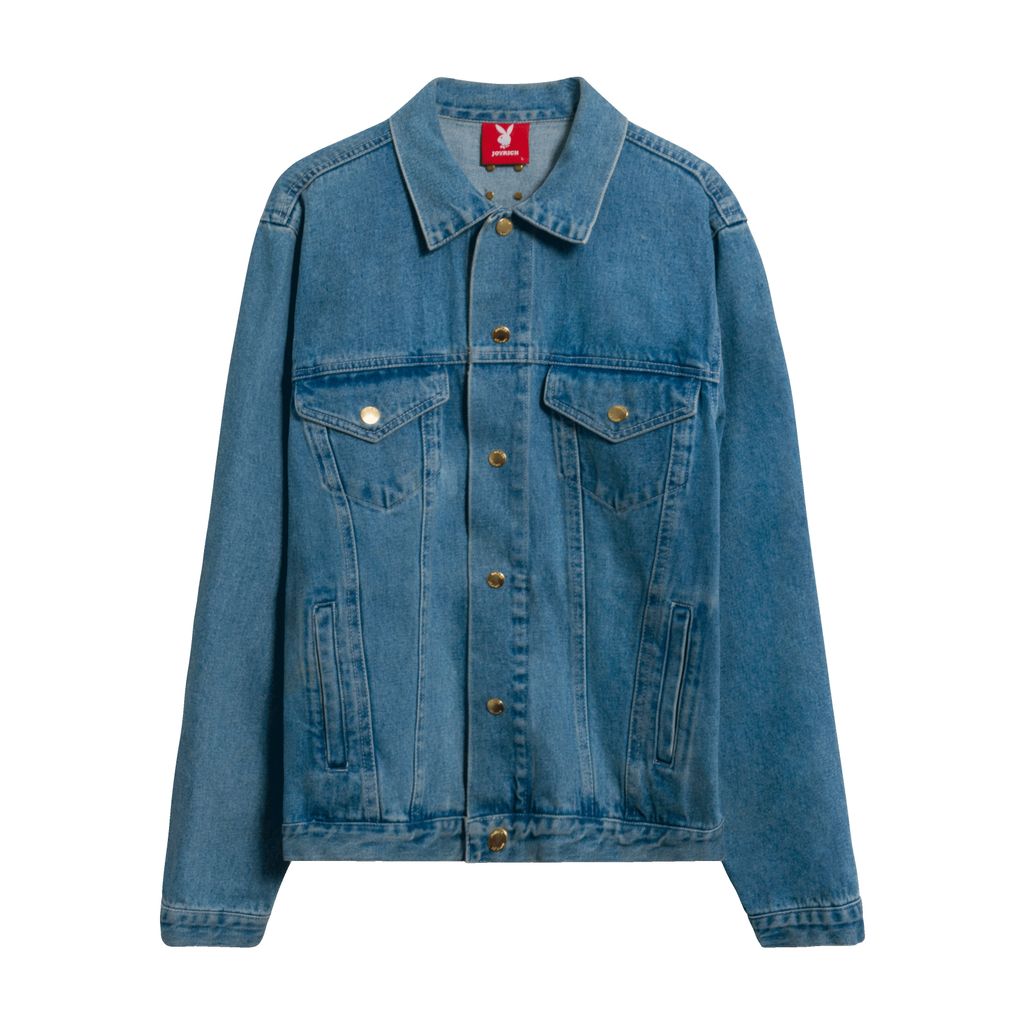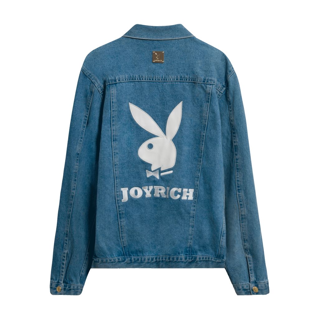 Like new, blue denim jacket with gold buttons, white embroidered lettering, and leather bunny. 100% Cotton. SIZE & FIT Unisex. Fits true to size for women. Men order size up.