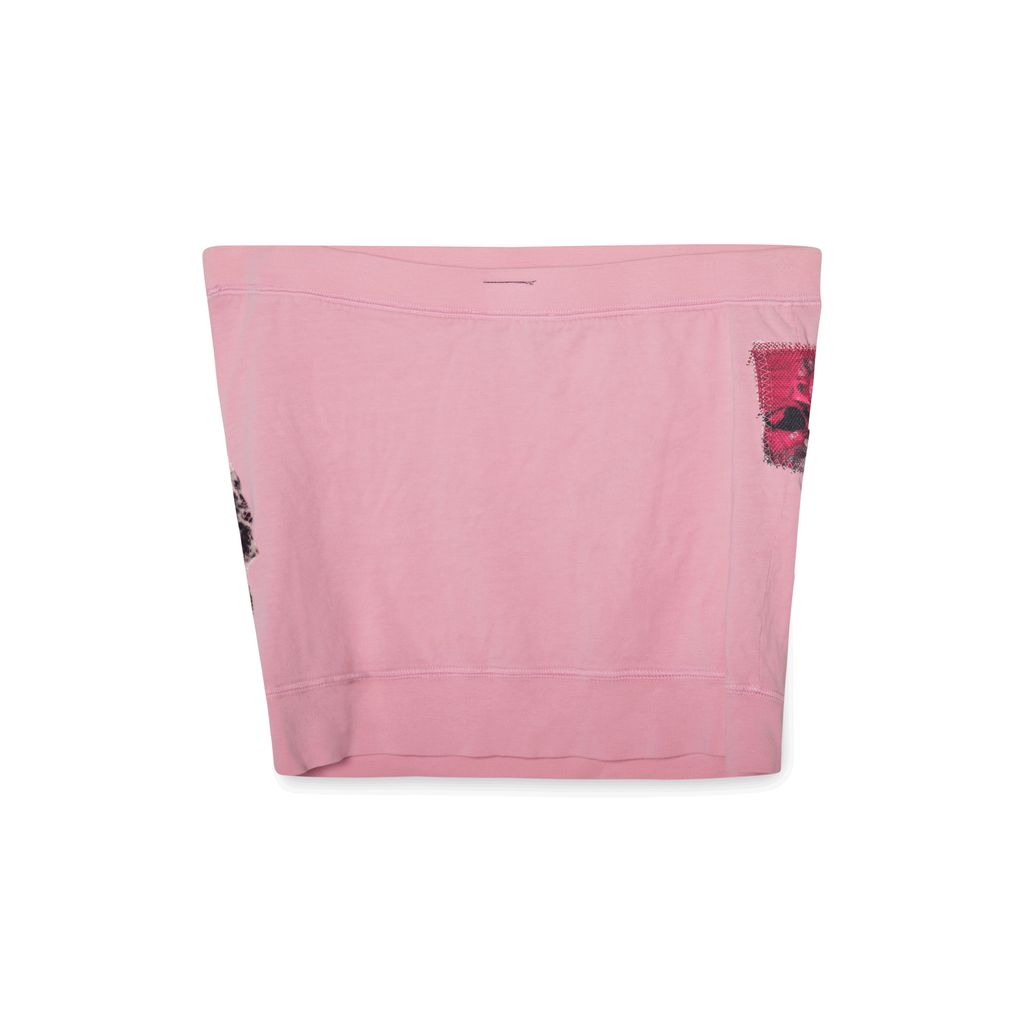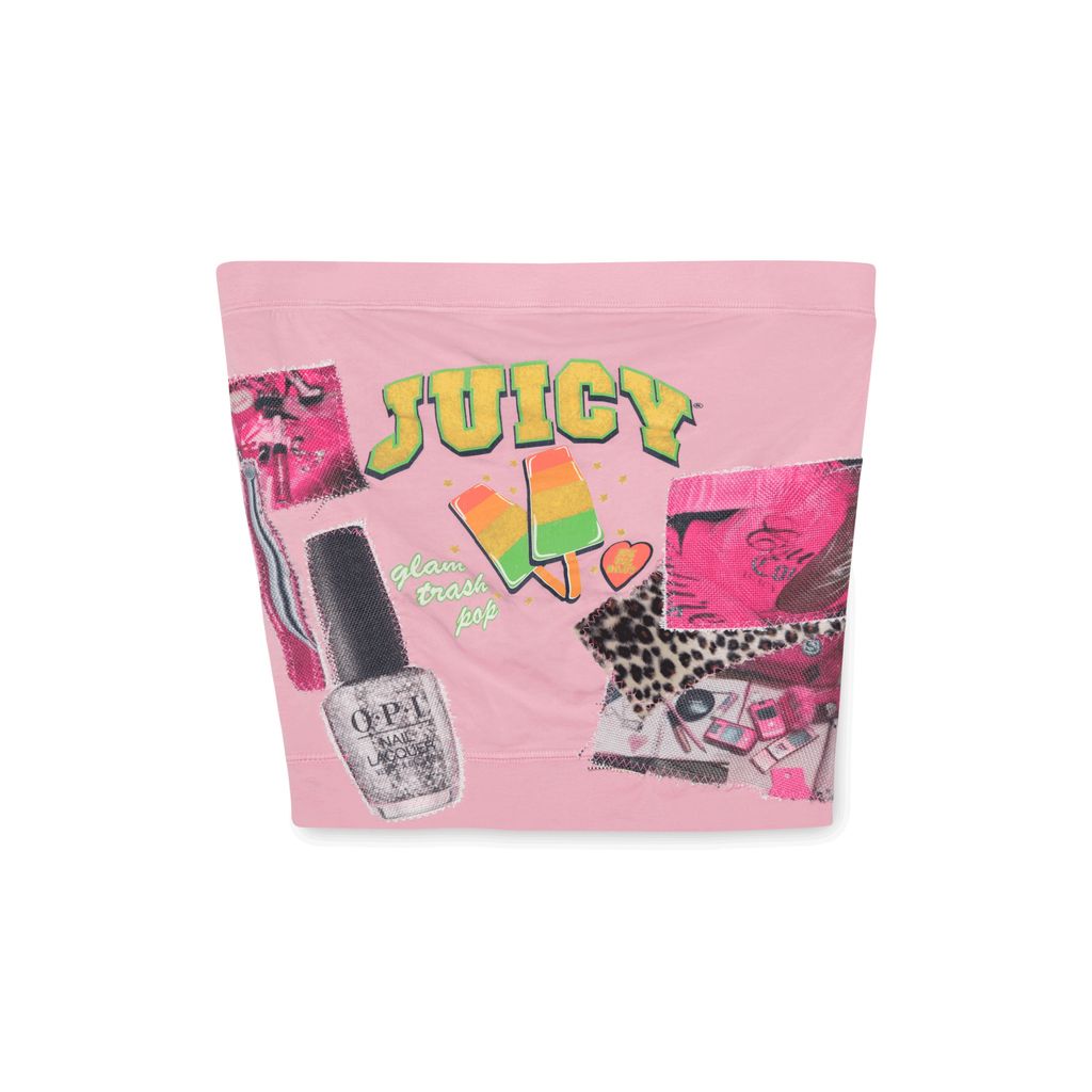 Juicy tube top features decorative patches and fuzzy bubble text.