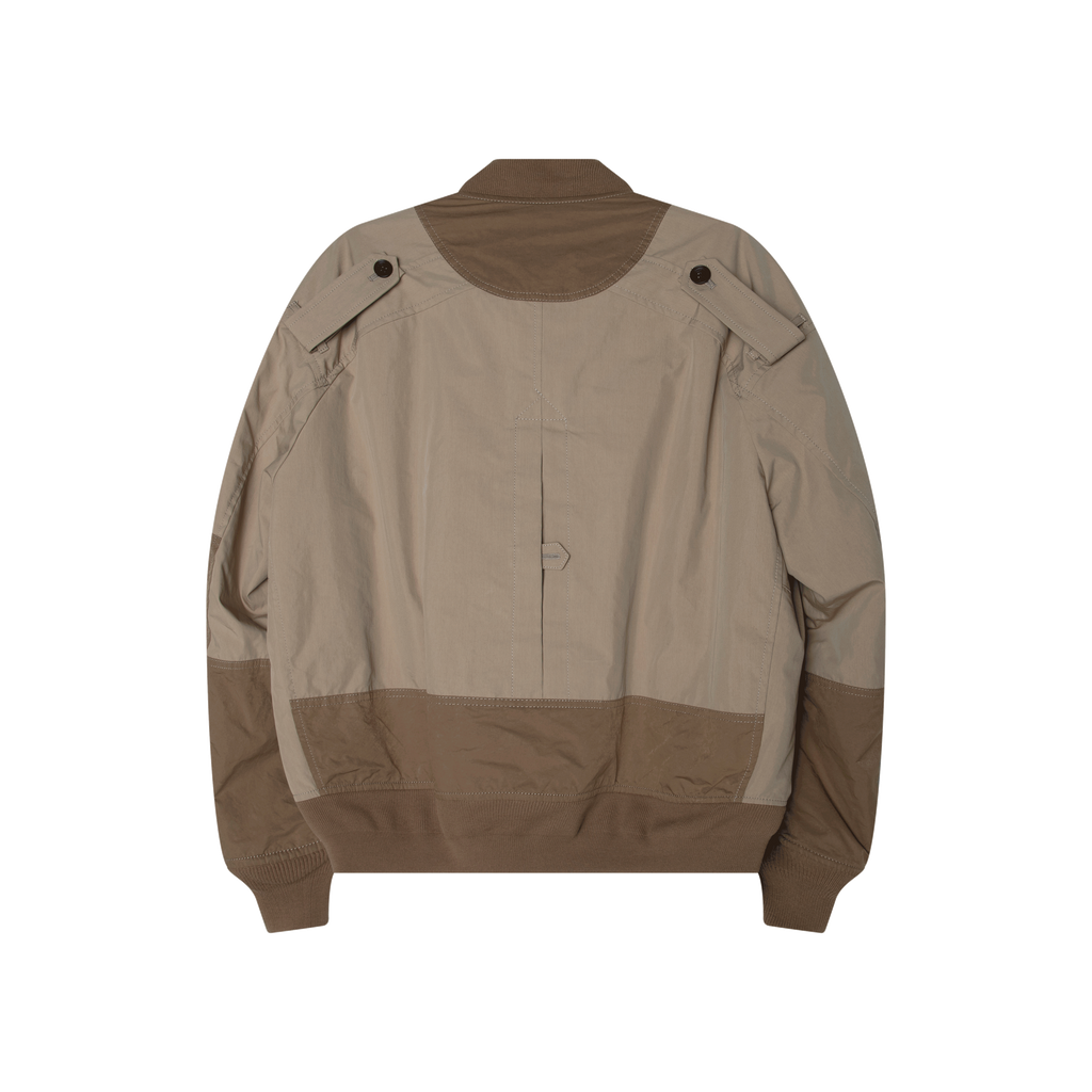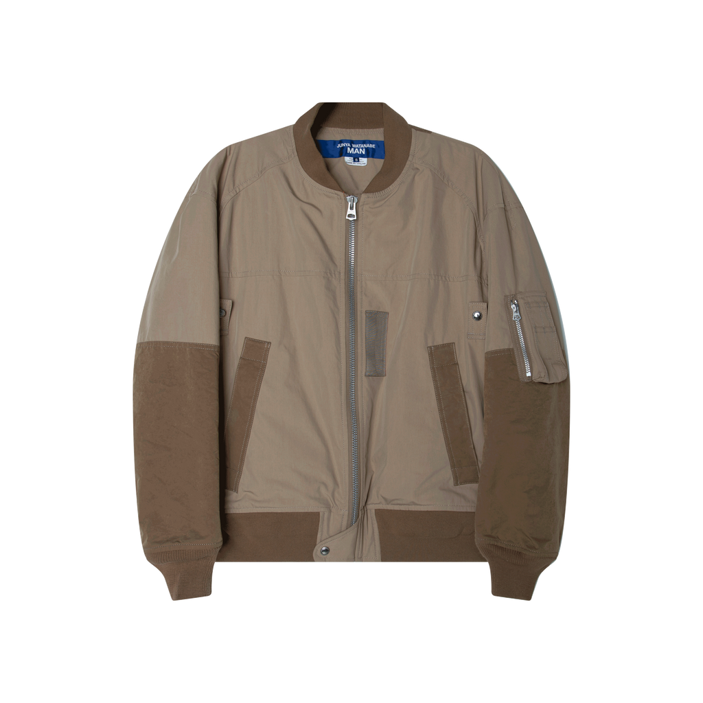Junya Watanabe MAN Panelled Bomber Jacket features beige panelled design, ribbed band collar, front zip closure, zleeve zip pocket, 2 front welt pockets, and ribbed cuffs and hem.