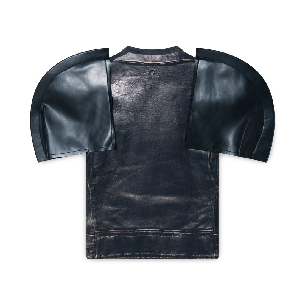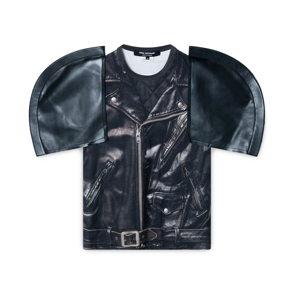Junya Watanabe x Comme des Garcons Trompe L'eoil Moto Top features printed polyester top with leather sleeves.