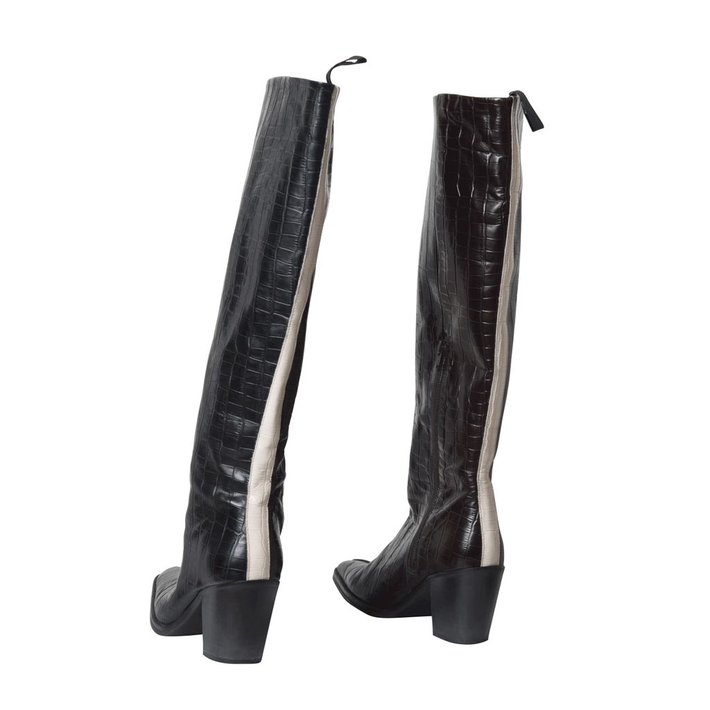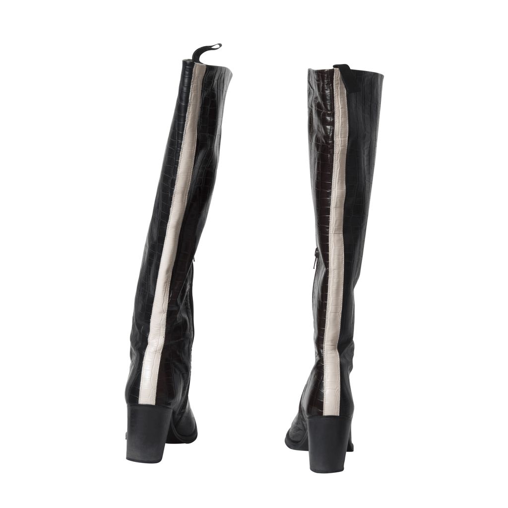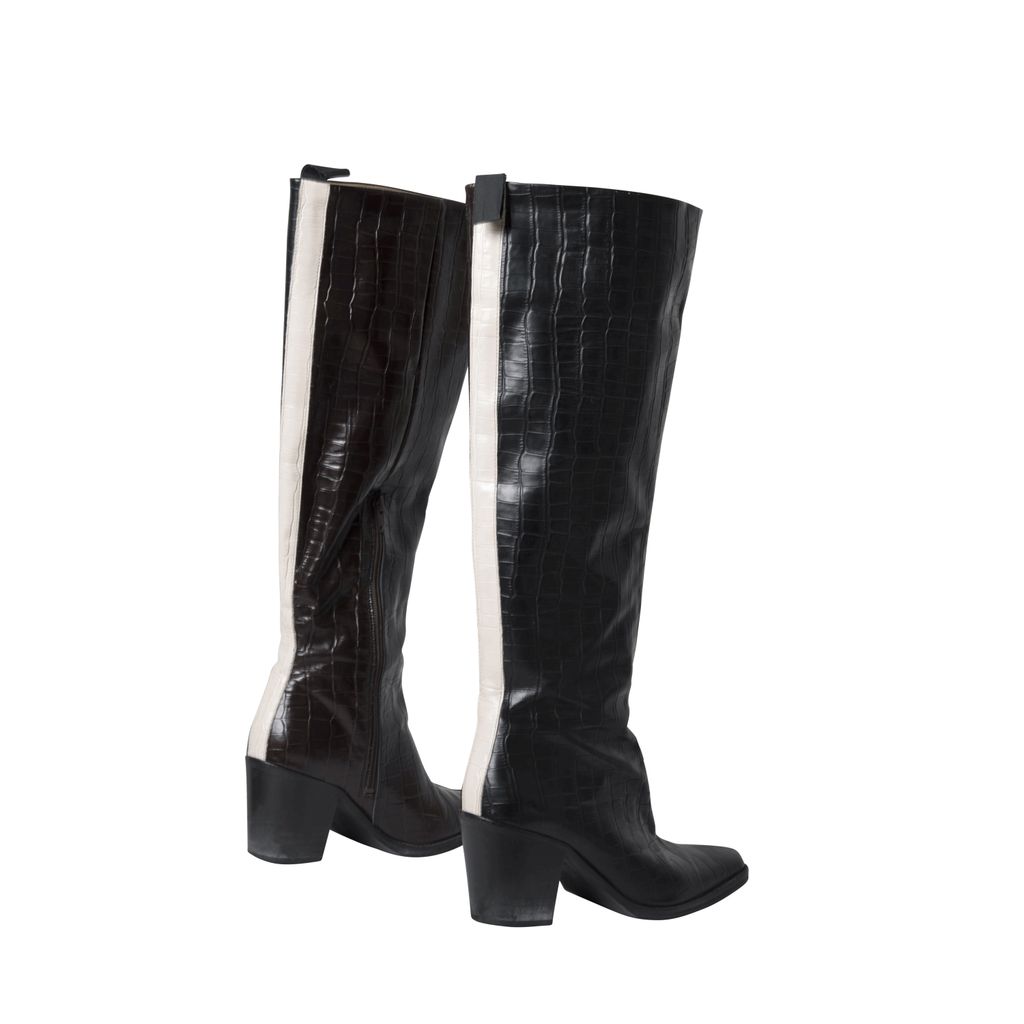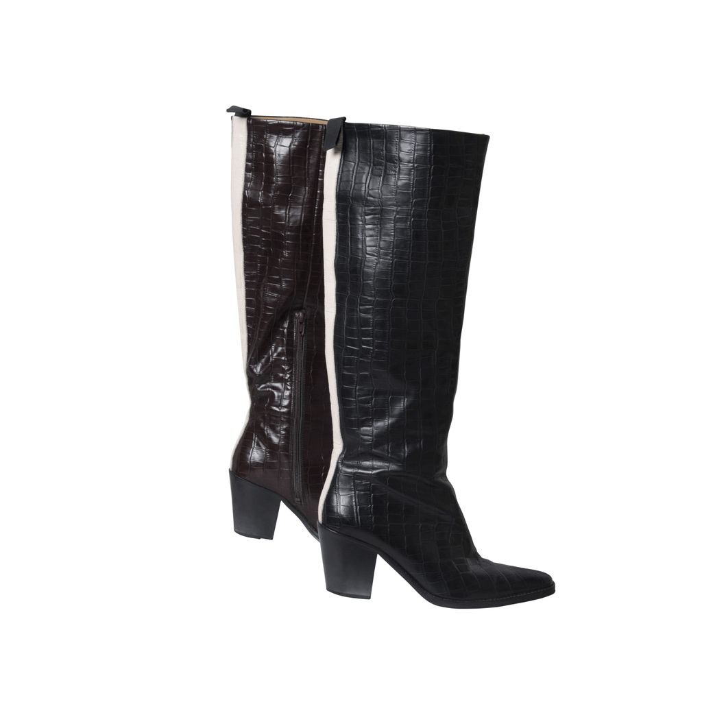 JUST dual tone croc boots feature brown and black coloring, a white stripe down the back and a zipper at the side.
