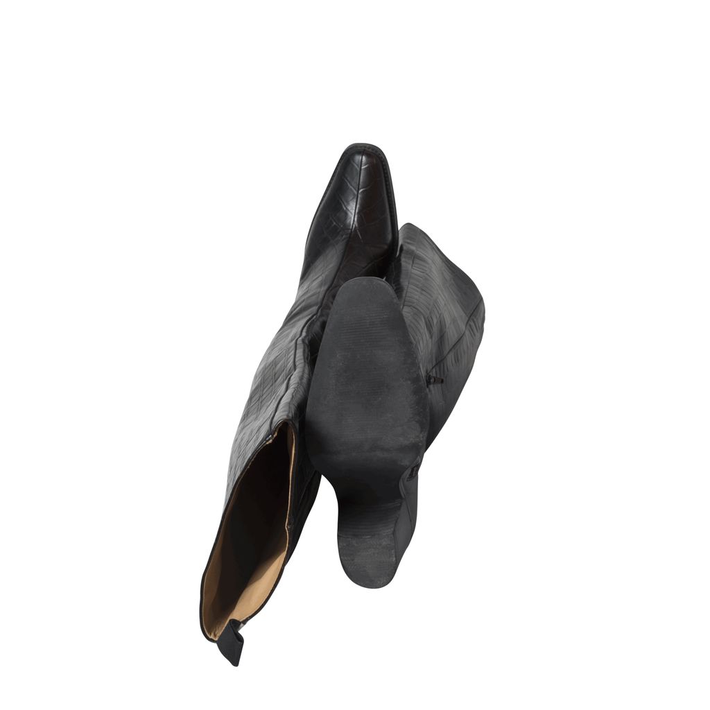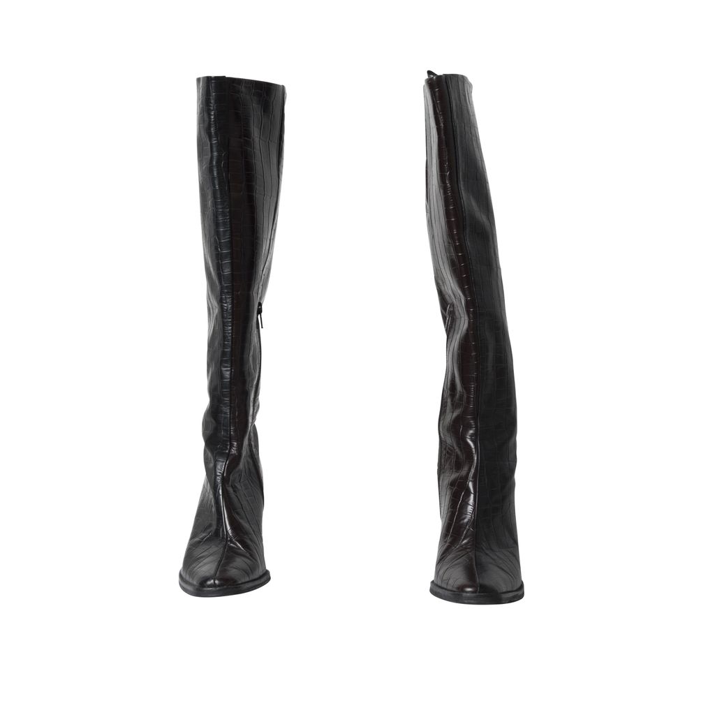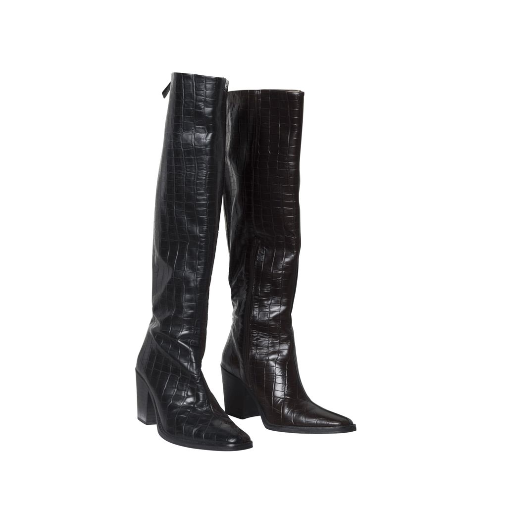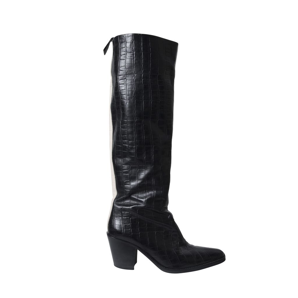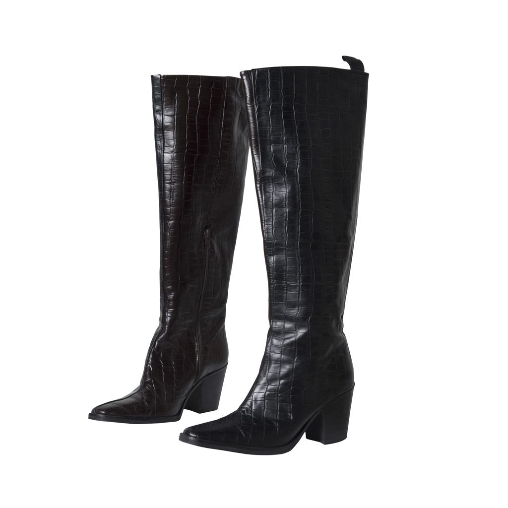 JUST dual tone croc boots feature brown and black coloring, a white stripe down the back and a zipper at the side.