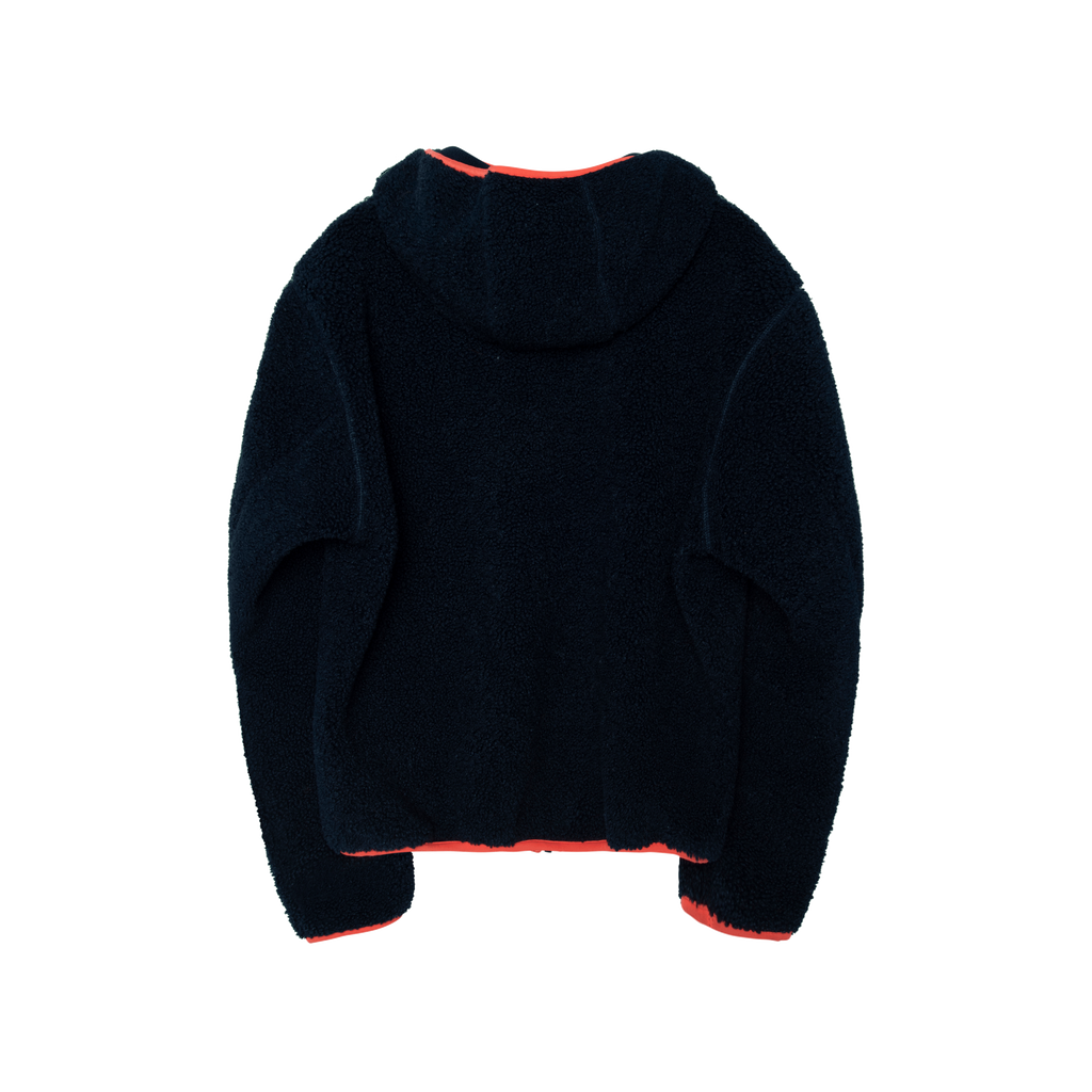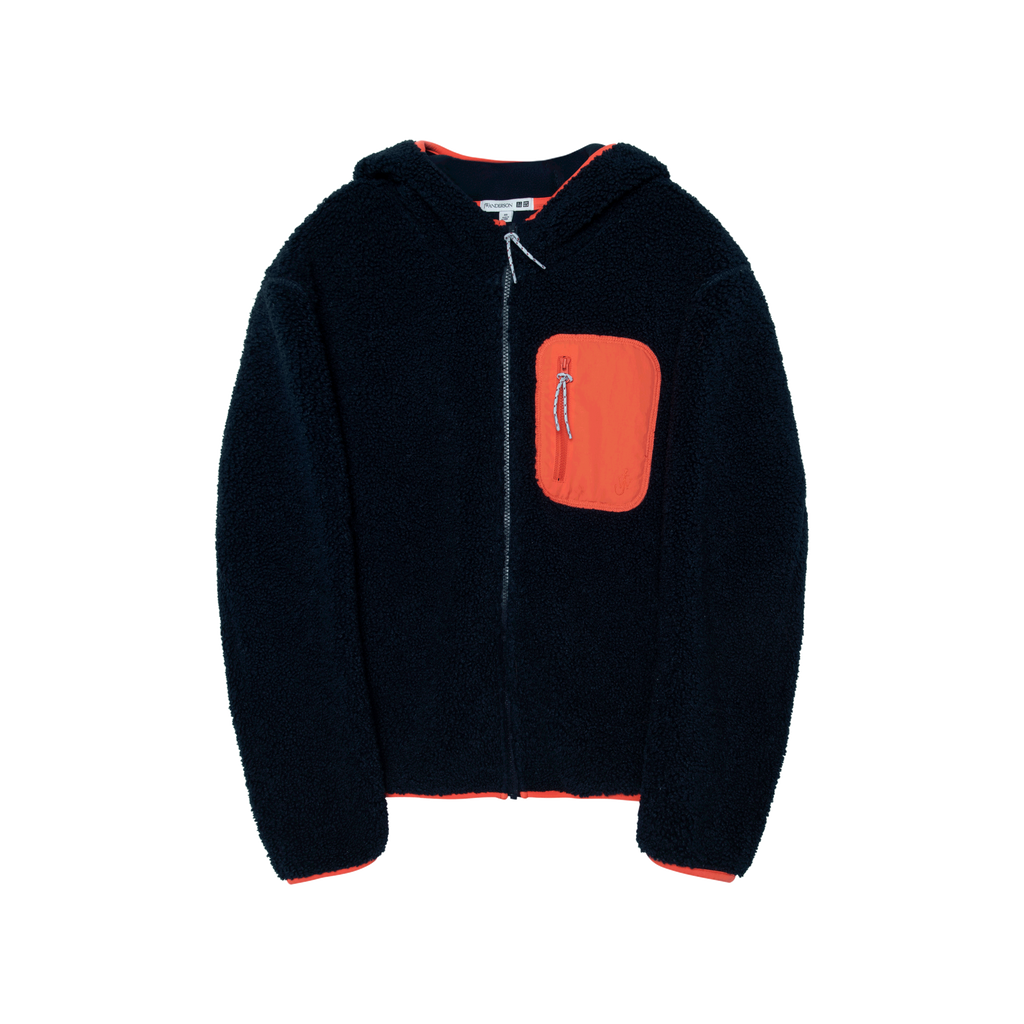 JW Anderson x Uniqlo Fleece Zip Up features navy blue fleece, orange piping and chest pocket, 2 side pockets, attached hood, front zip closure, and bungee cord as zipper pulls.