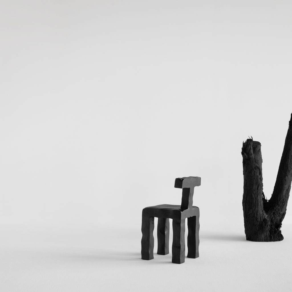 Hand curved Ash wood, burned to create black color smoothed and then matte lacquered.