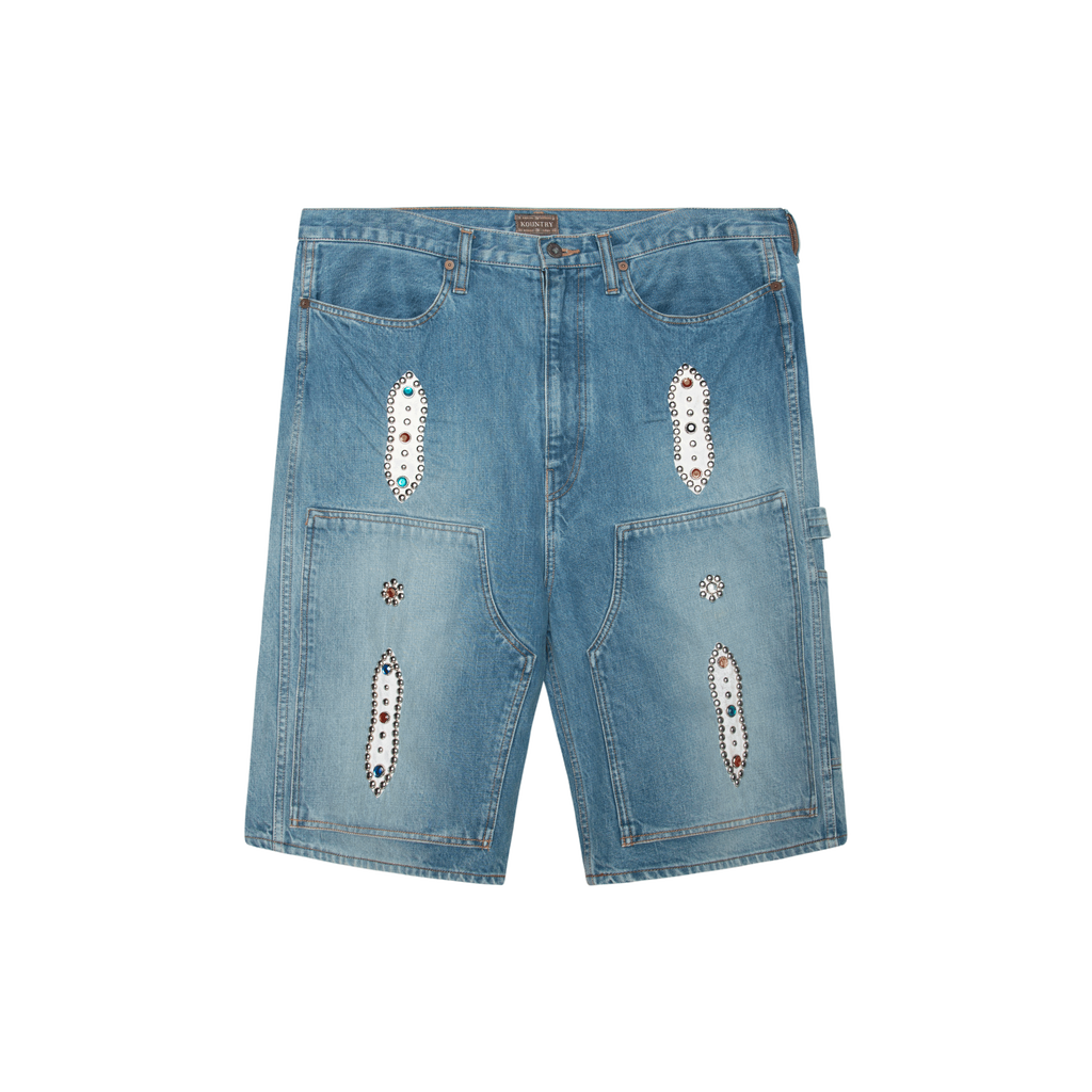 Kapital Denim Shorts features front button closure, two front pockets, embellish design detail, hammer loop and plier pocket.