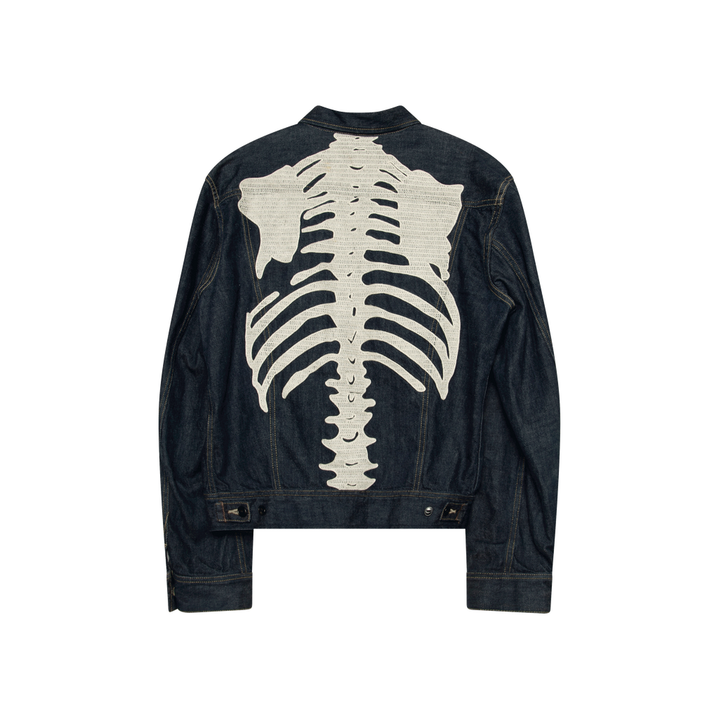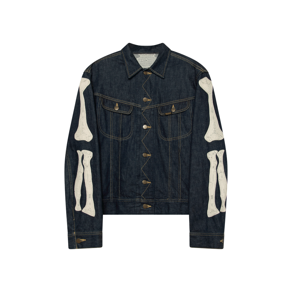 Kapital Mexican Tuxedo Denim Westerner Jacket features front button closure, two front chest pockets, button closure cuffs, and bone embroidery through out.