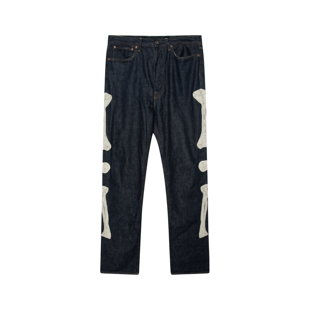 Kapital Mexican Tuxedo Jeans feature front and back pockets, large deformed bone embroidery on the sides, and front button closure.