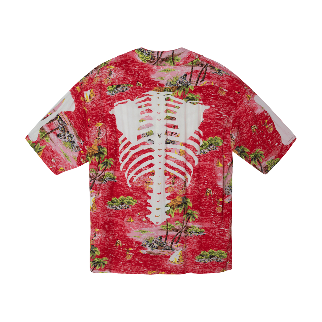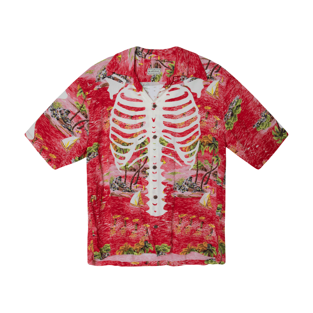 Kapital Red Rayon Kamekameha Bone Aloha Shirt features cheerful landscape of the southern country, bone design on front, sleeves, and back, and front button closure.
