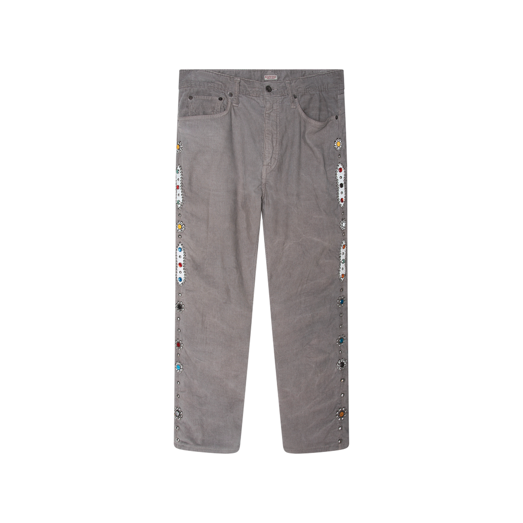 Kapital Straight Leg Embellished Corduroy Pants feature front button closure, two front pockets, two back pockets, and embellished appliqué detailed sides.