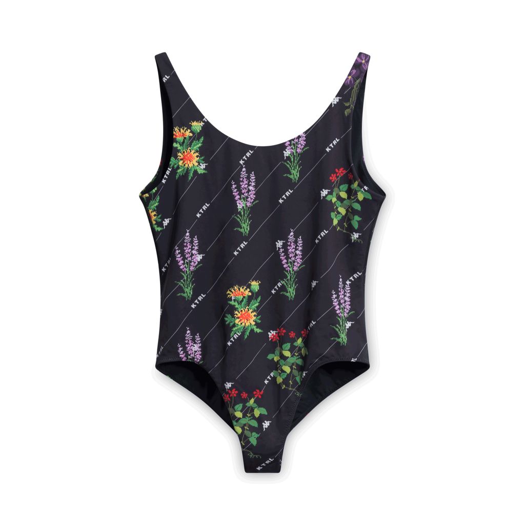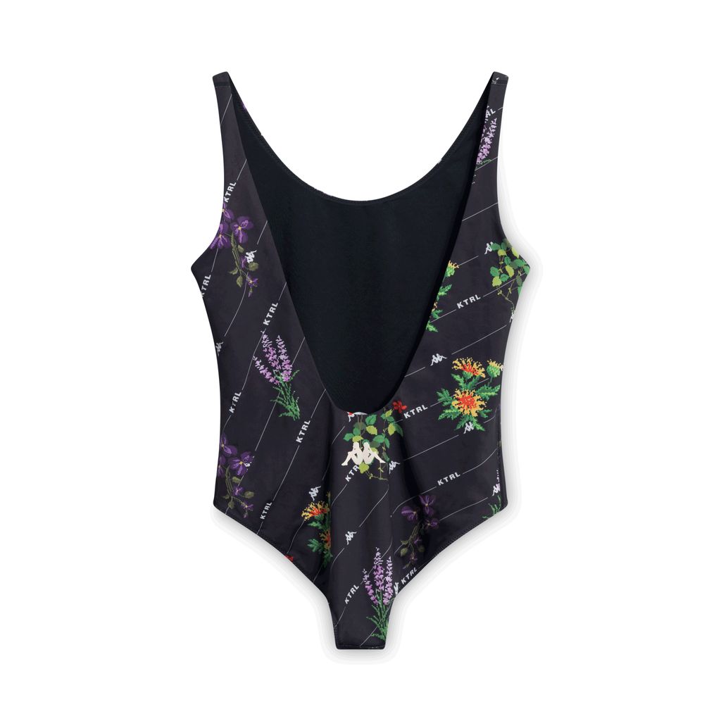 Black one-piece swimsuit from Kappa Kontroll featuring an all-over pixelated floral graphic and the iconic white logo printed below the back. Scoop neck with plunging back makes this a sexy silhouette for the summer.