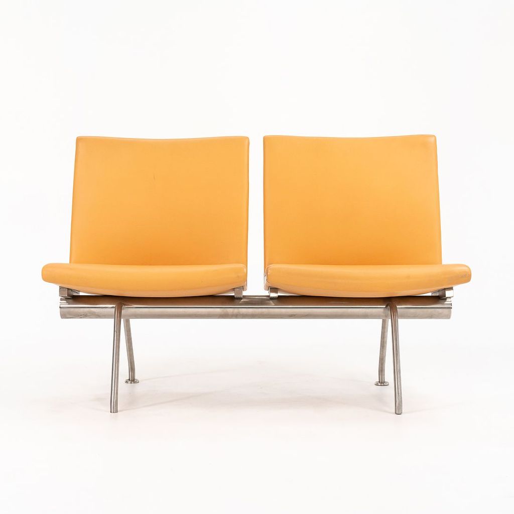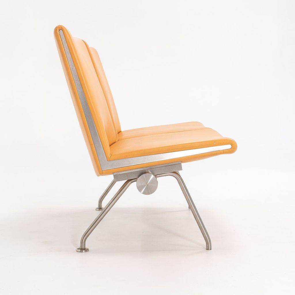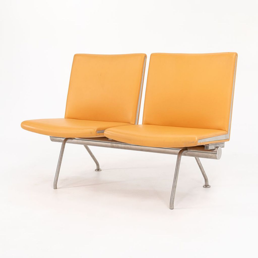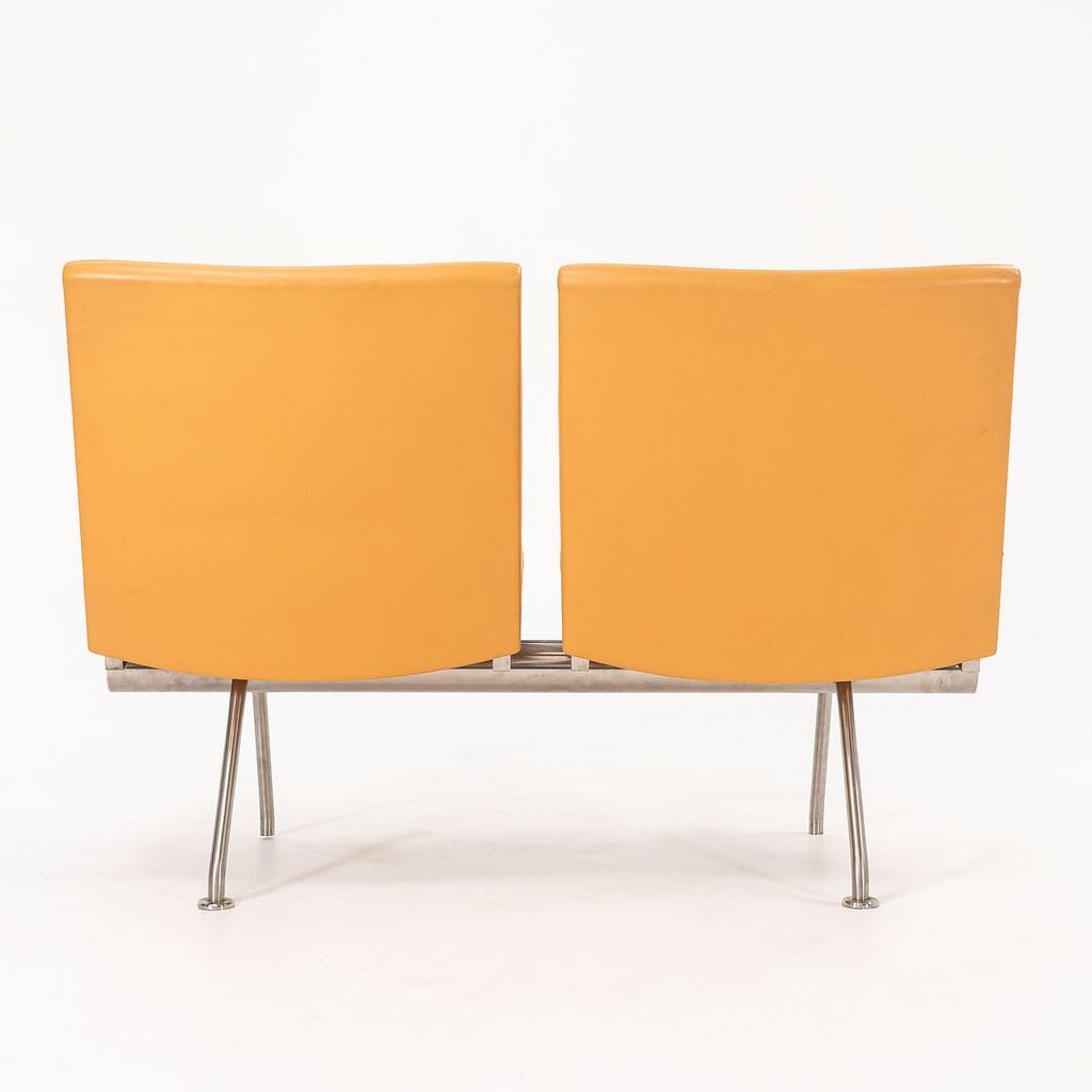Listed for sale is a CH402 Two-Seater Kastrup sofa without arms. The sofa is made with a stainless steel frame and natural color leather. Designed by Hans Wegner and produced by Carl Hansen & Son in Denmark, the sofa dates circa 2021 and is guaranteed as authentic. It appears to be a Sif leather based on our assessment, but we do not guarantee the exact leather. It was a Carl Hansen-specced material. The sofa is in very good condition and shows some wear from use. It has some light scuffs including on the front right side and a small scuff on the seat, though overall its very nice. With some leather cleaner and conditioner, the scuffs should blend and then patina nicely. See photos.
