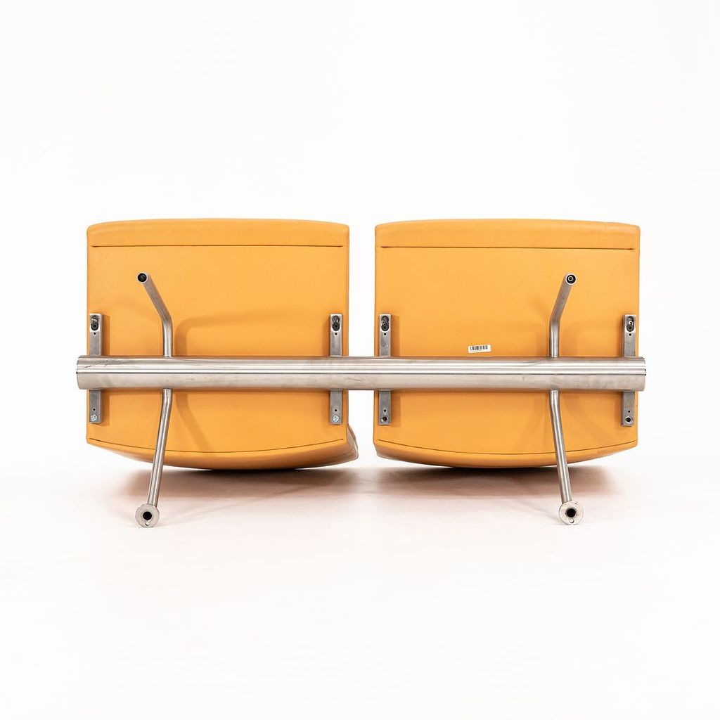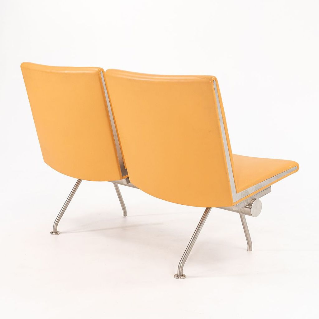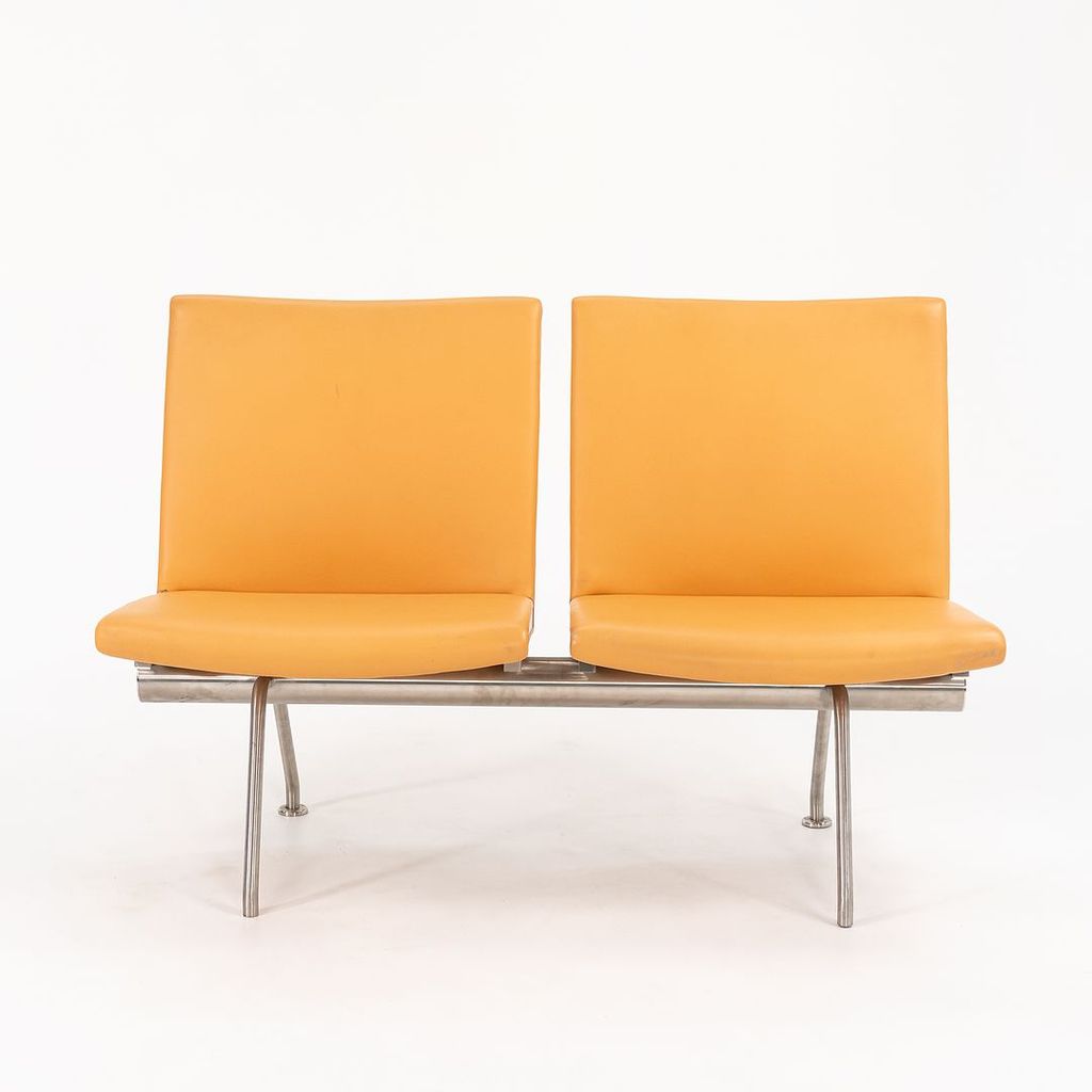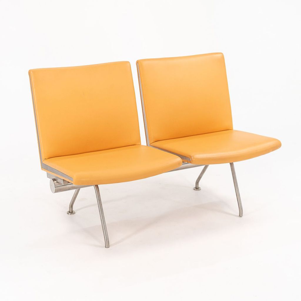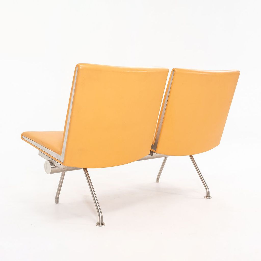 Listed for sale is a CH402 Two-Seater Kastrup sofa without arms. The sofa is made with a stainless steel frame and natural color leather. Designed by Hans Wegner and produced by Carl Hansen & Son in Denmark, the sofa dates circa 2021 and is guaranteed as authentic. It appears to be a Sif leather based on our assessment, but we do not guarantee the exact leather. It was a Carl Hansen-specced material. The sofa is in very good condition and shows some wear from use. It has some light scuffs including on the front right side and a small scuff on the seat, though overall its very nice. With some leather cleaner and conditioner, the scuffs should blend and then patina nicely. See photos.