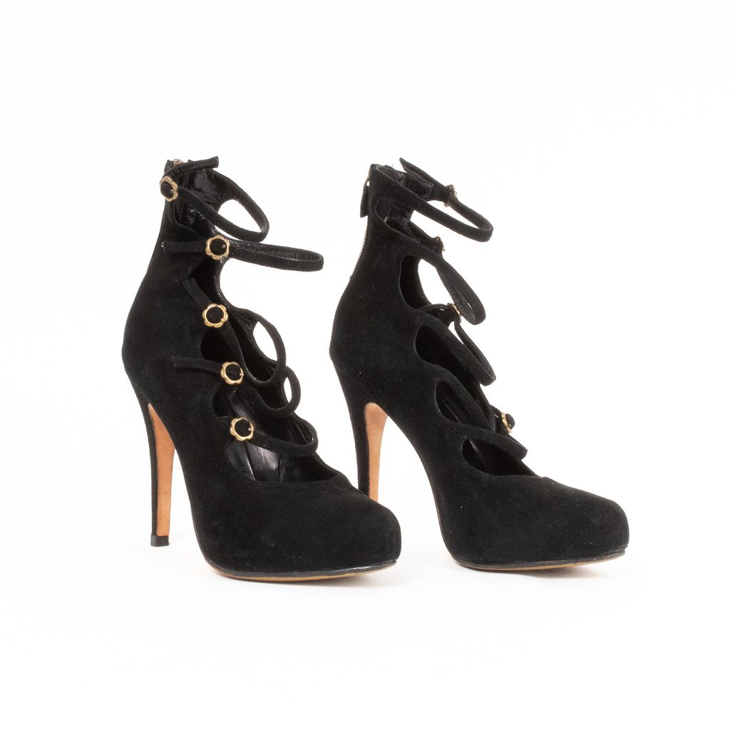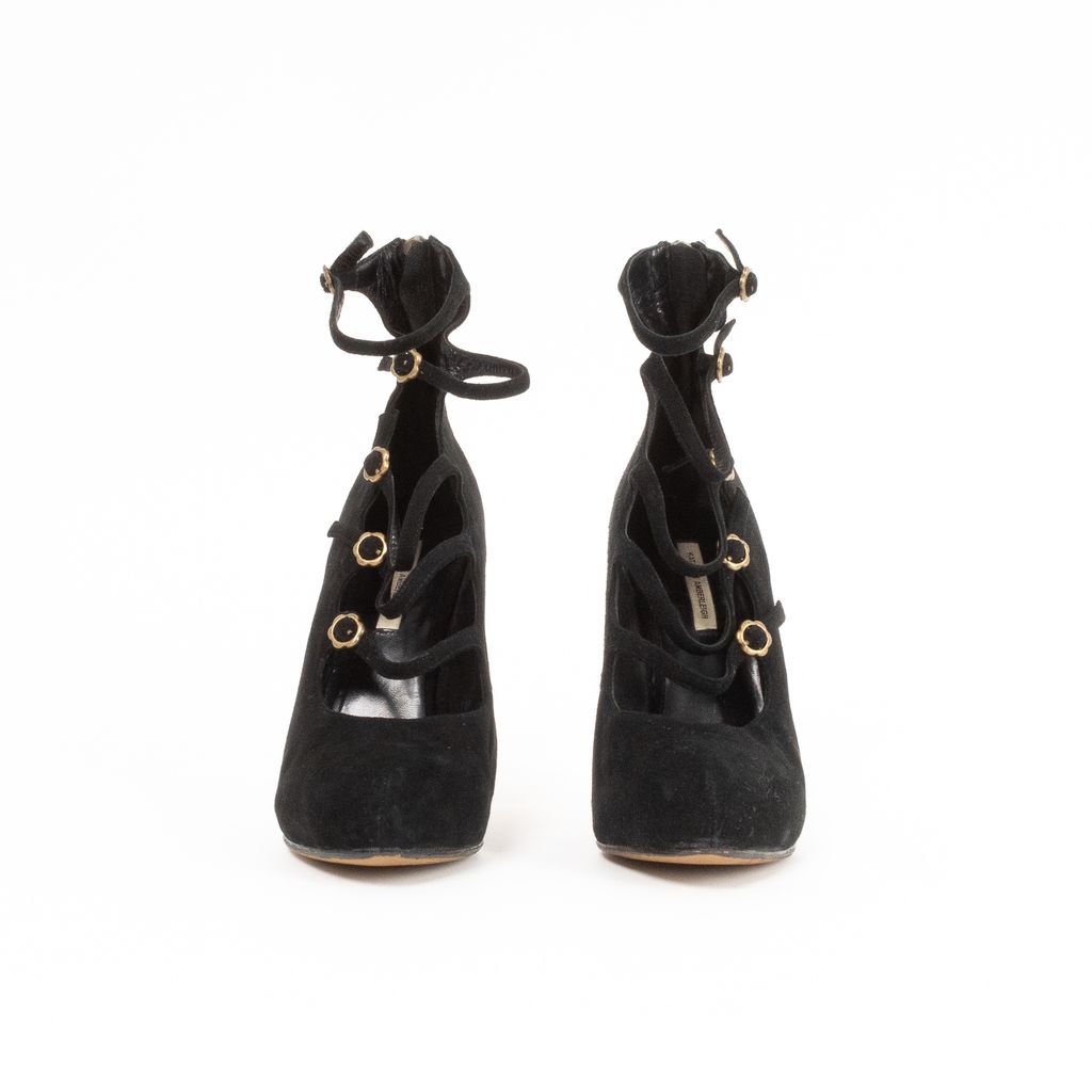 These Kathryn Amberleigh heels give us 60's and 70's throwback vibes with their multi strap Mary Jane style body and floral buckle clasps. Features 5 strap top with adjustable buckle closure, zip back closure, rounded toe, platform heel, and 4" heel height.