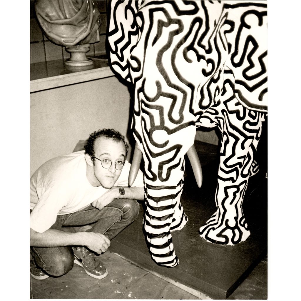 Framed photograph of Keith Haring with a Painted Elephant Statue at 22 East 33rd Street, 1985, by Andy Warhol. This is a unique work. This work is stamped on the verso by the Estate of the Artist and The Andy Warhol Foundation for the Visual Arts and also includes a Foundation number which is written on verso. Work comes with a Certificate of Provenance.