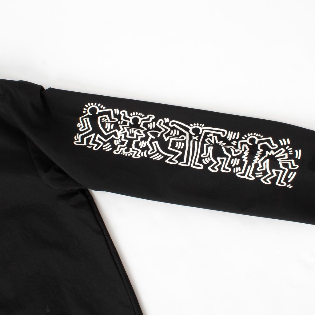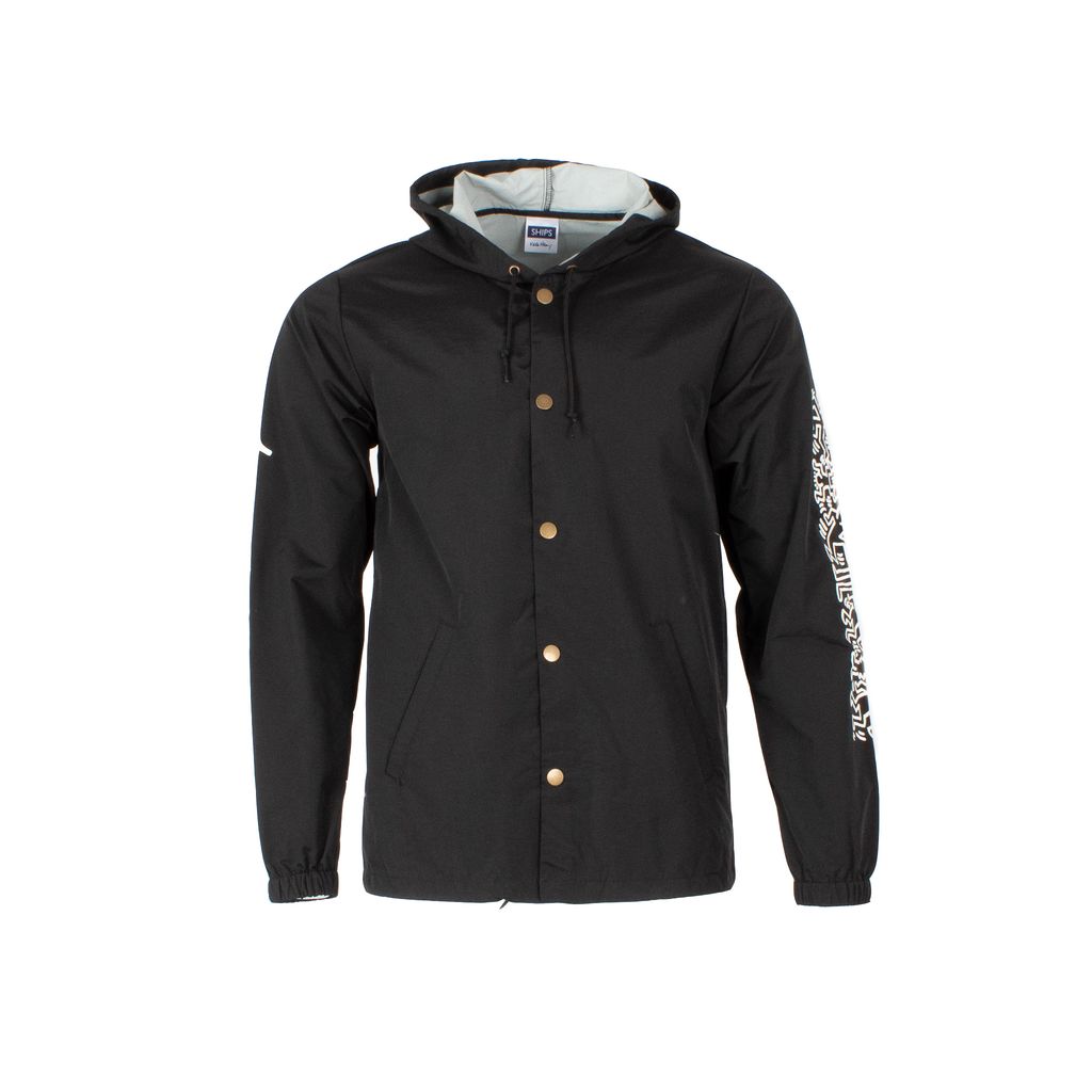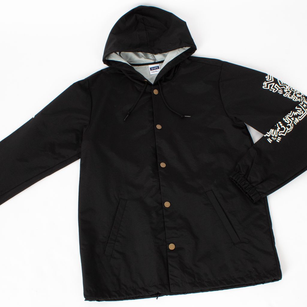 Become walking street art in this coaches jacket from streetwear brand SHIPS JET BLUE. Features large Keith Haring graphics on back and sleeves, snap closures, adjustable drawstring at waist, and elastic cuffs.