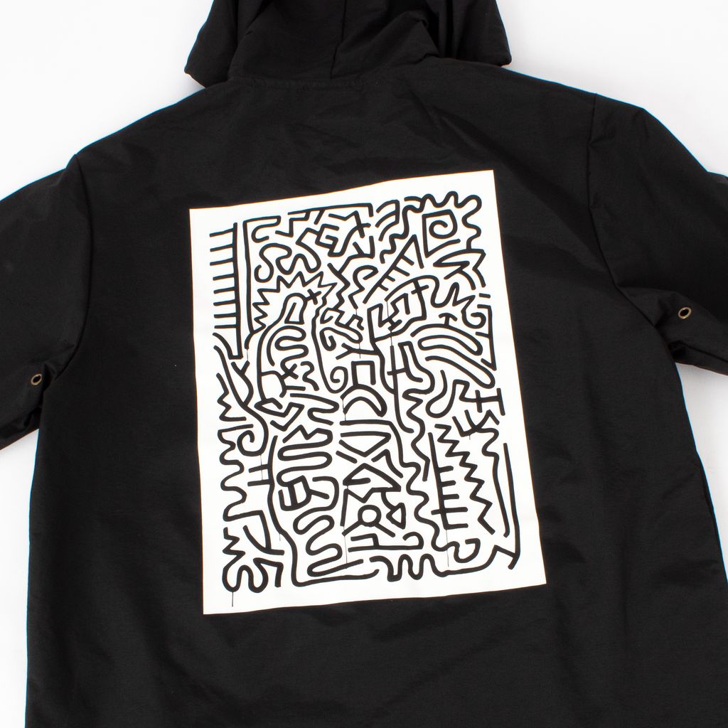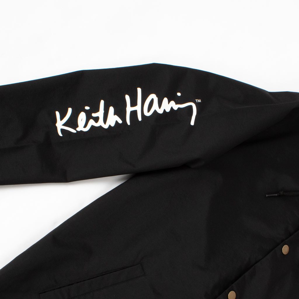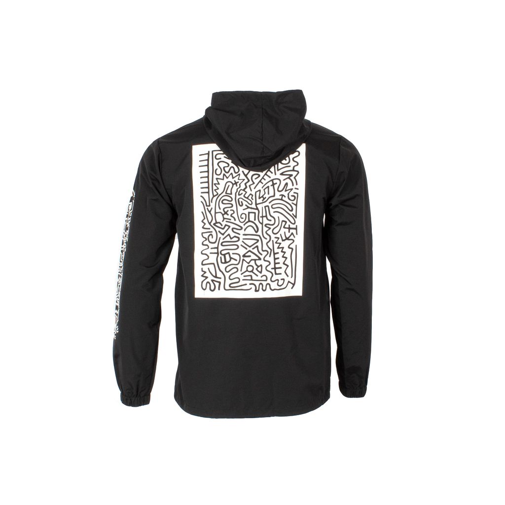 Become walking street art in this coaches jacket from streetwear brand SHIPS JET BLUE. Features large Keith Haring graphics on back and sleeves, snap closures, adjustable drawstring at waist, and elastic cuffs.