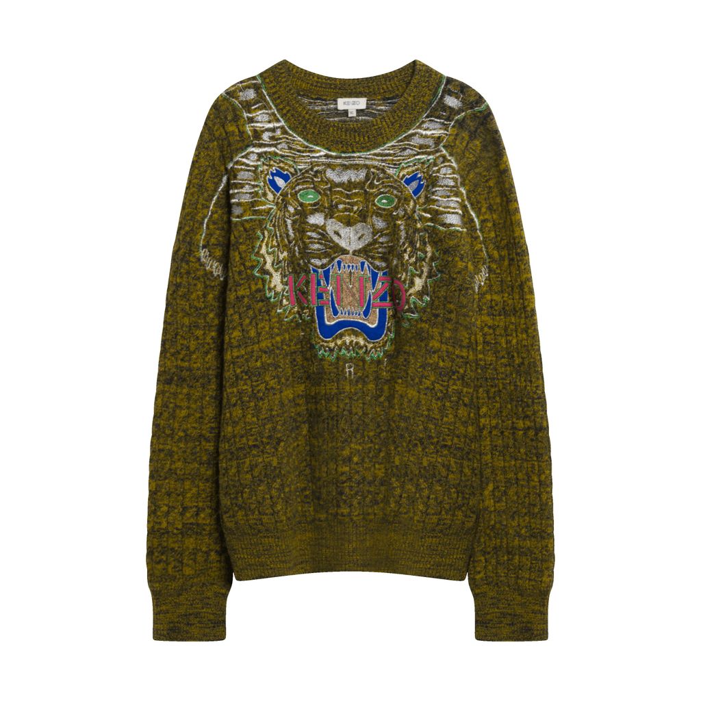 Calling all wild things! This sweater from Kenzo pairs their iconic embroidered logo with some feline flair. Features duotone sweater knit, multicolor Kenzo logo and tiger embroidery on top front and back, rib knit bands at neck, wrists, and bottom hem, and slim cut body.