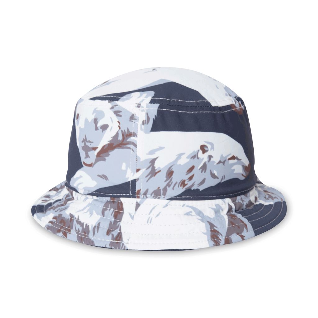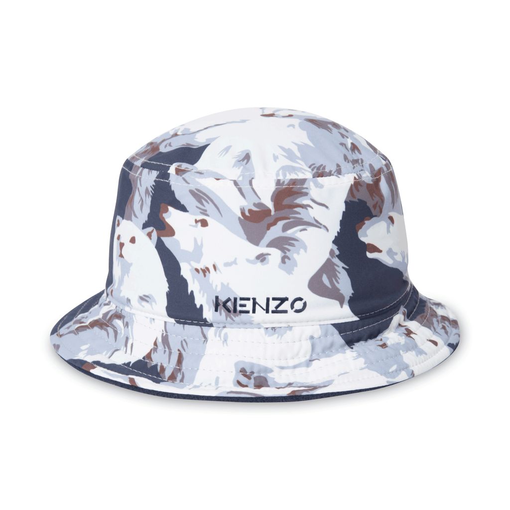 Kenzo Polar Bear Reversible Bucket Hat features dual patterns, one in blue and the other in blue camouflage.