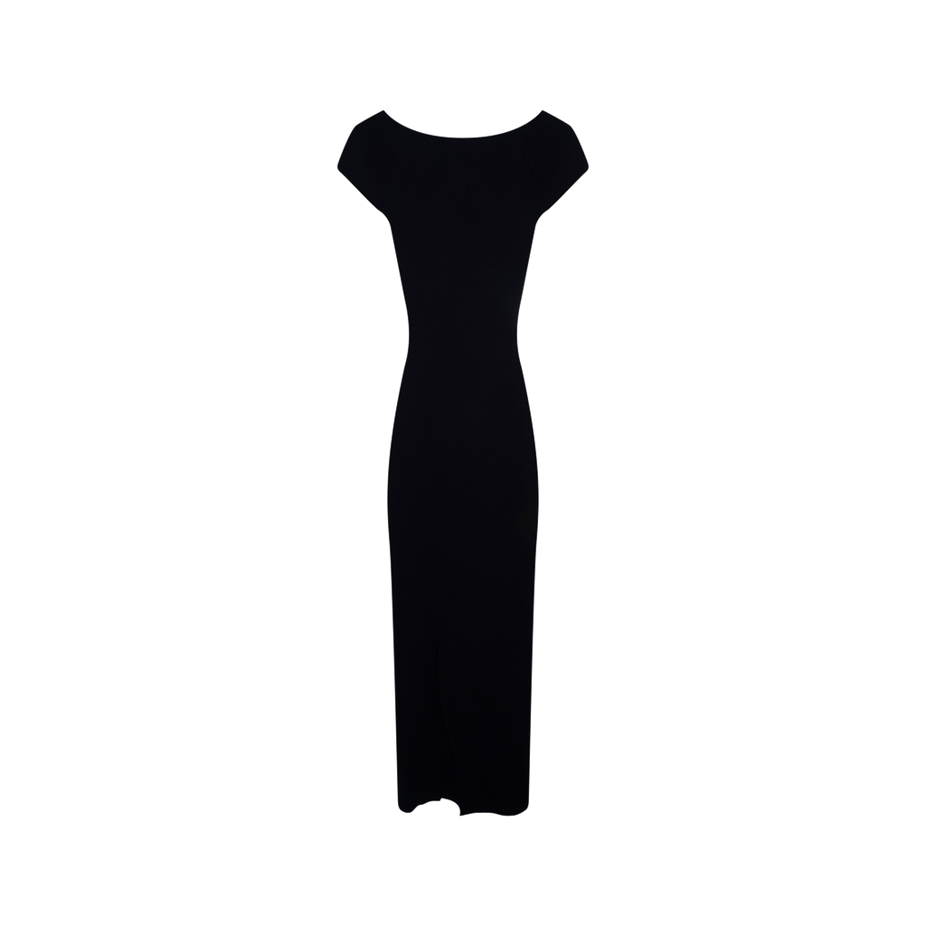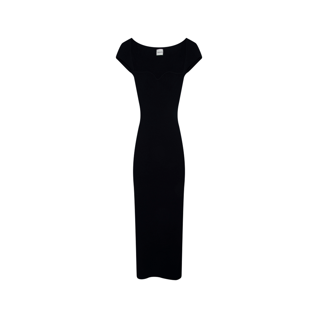 Khaite Allegra Cap Sleeve Bustier Black Dress features fitted silhouette, slip on design, cap sleeves, sweetheart neckline, and back slit.