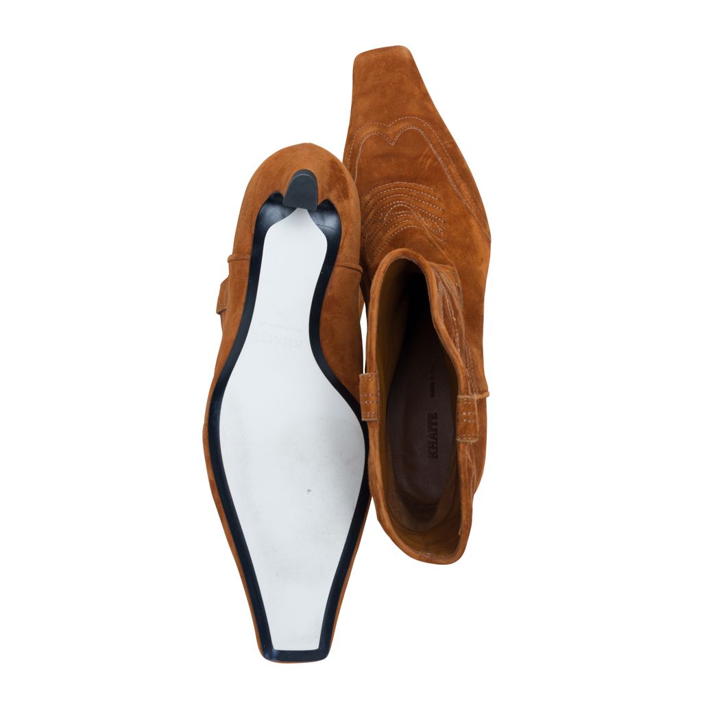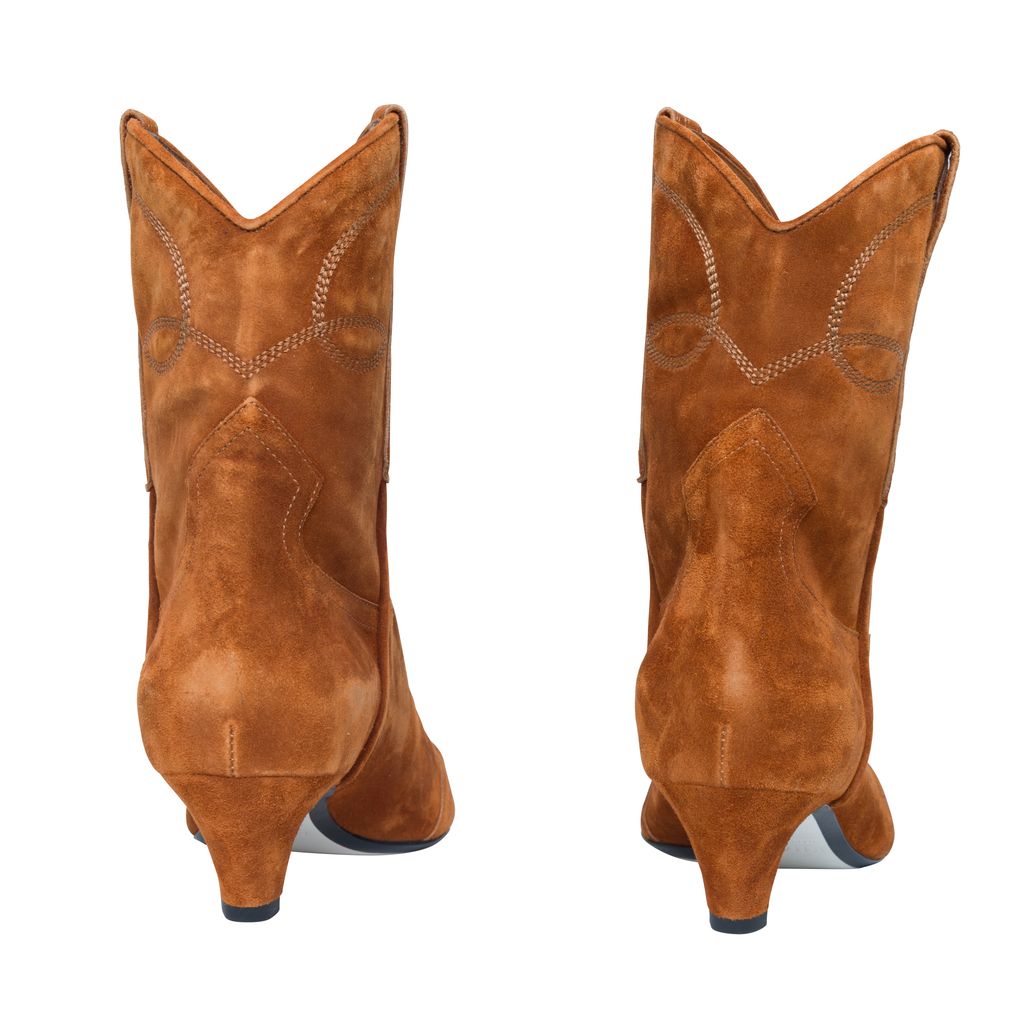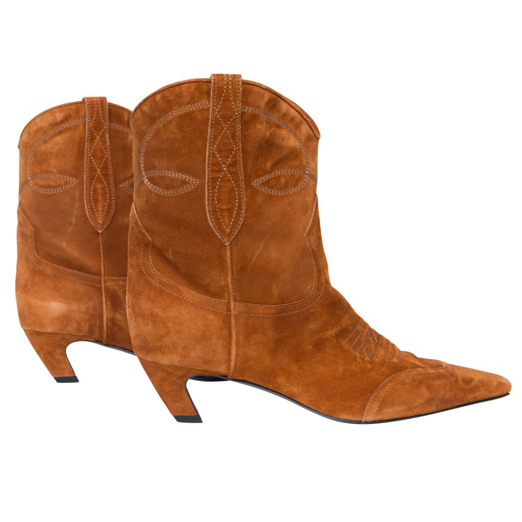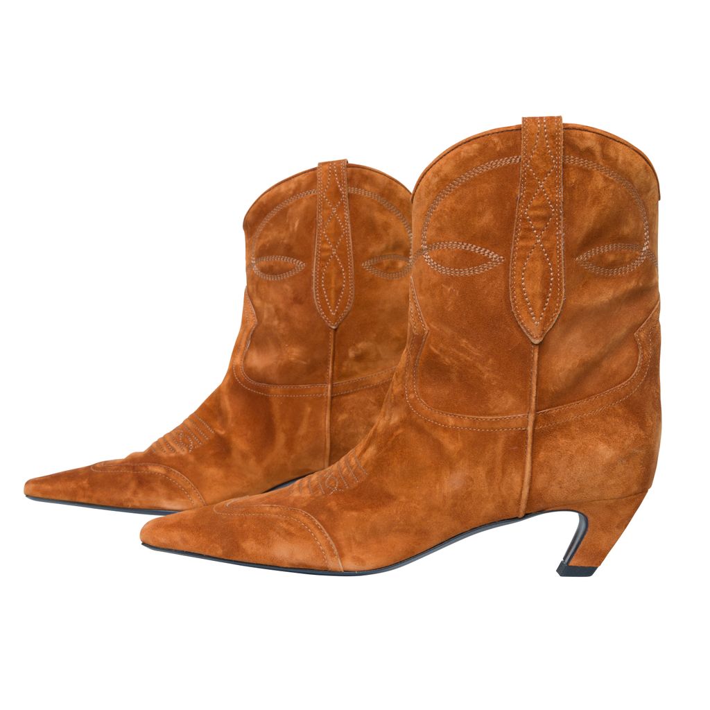 Khaite Dallas Suede Cowboy Boot features velvet suede, reinforced toe box, and curved heel.