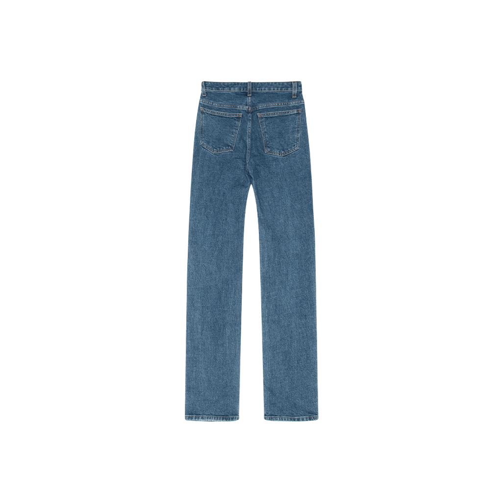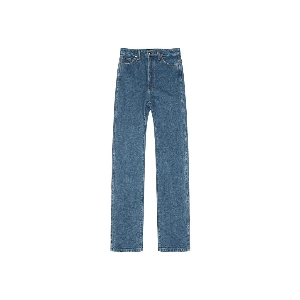 Khaite Danielle Straight Leg Jean features 5 pocket, hight waist, and antique brass button closure.