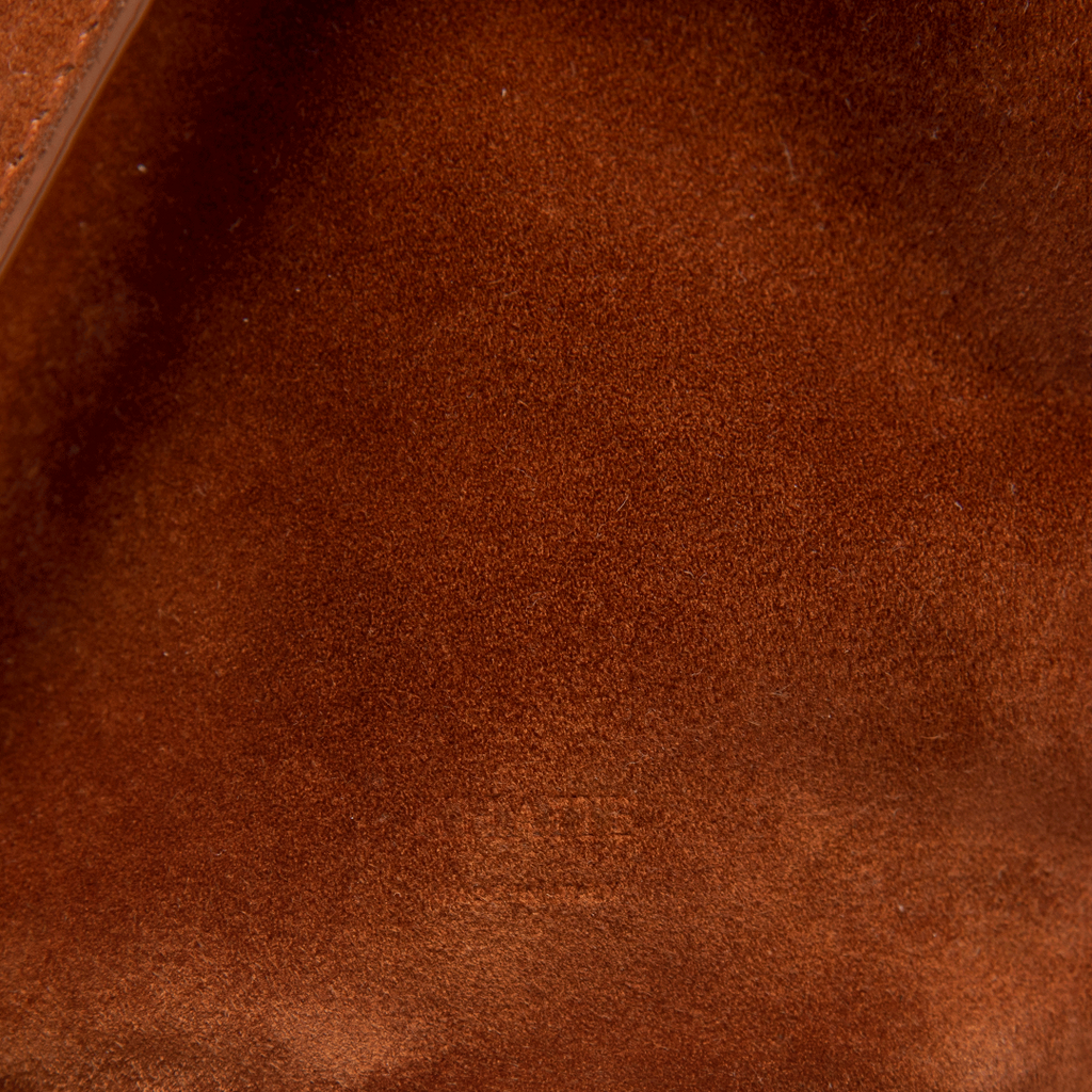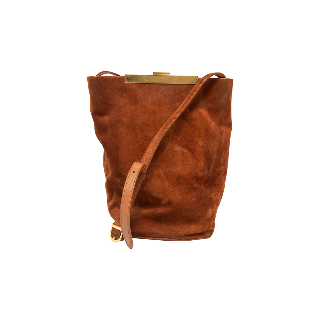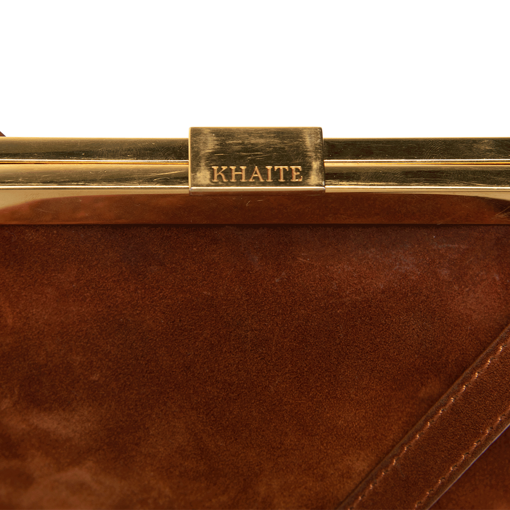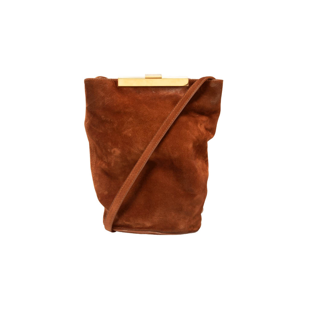 Khaite Etta Suede Bucket Bag In Brown features gold-tone hardware, flap top closure, and adjustable strap.