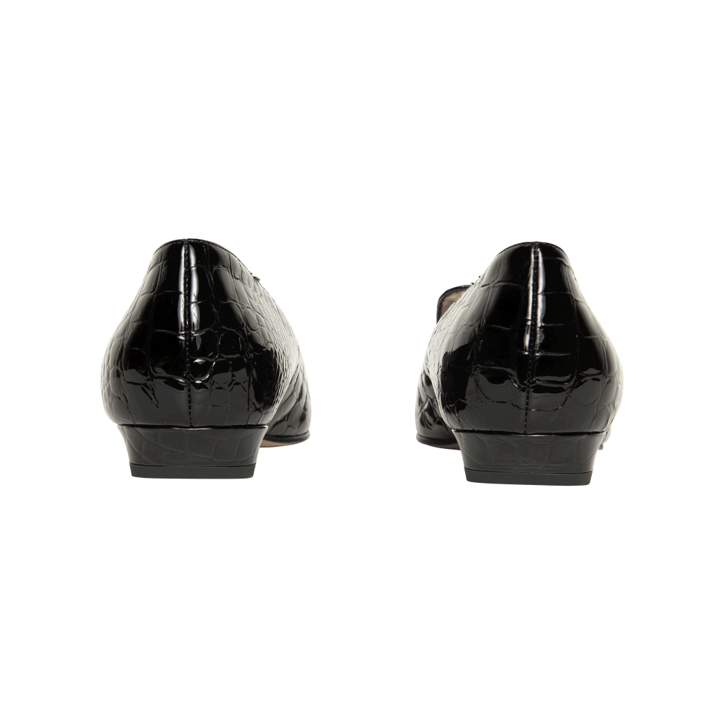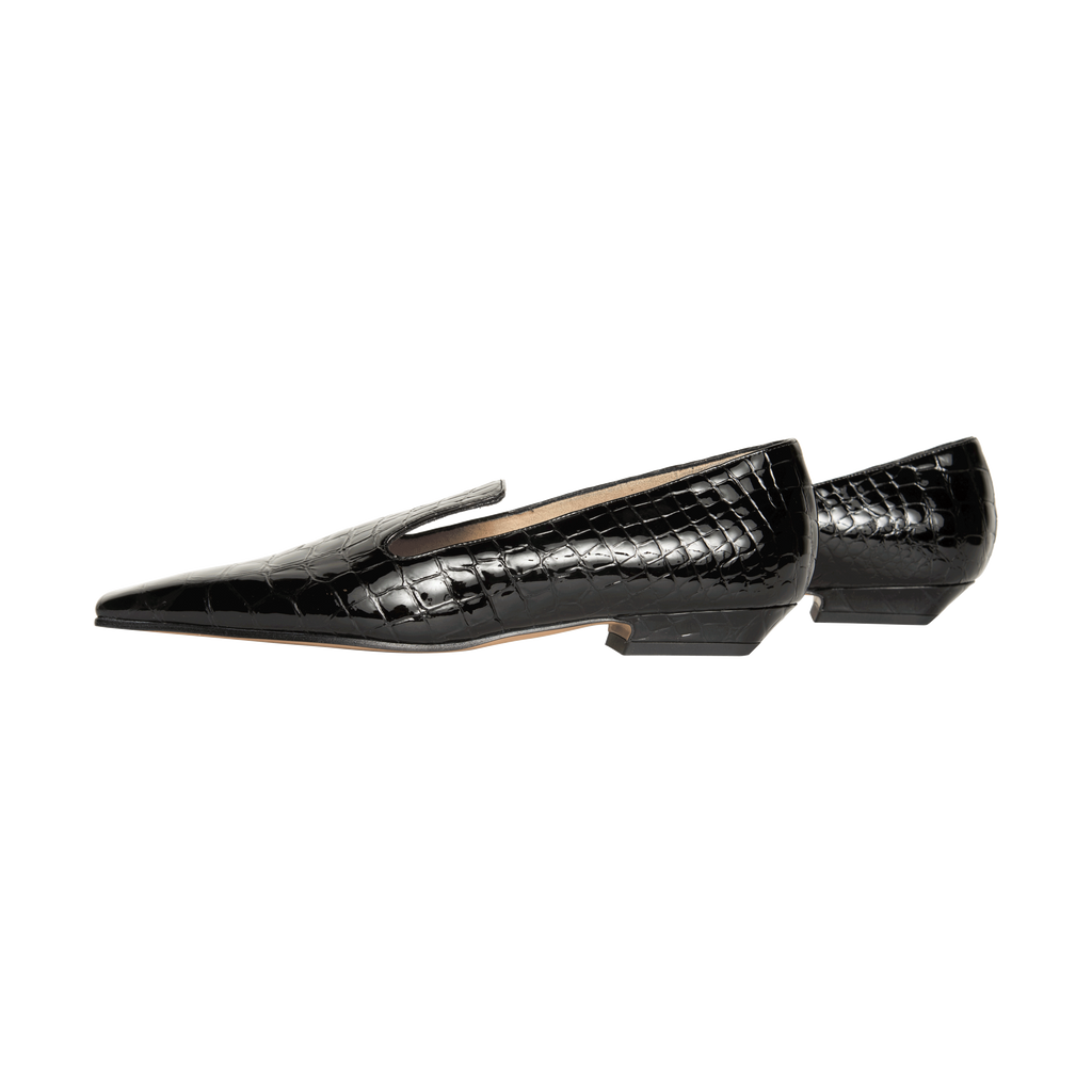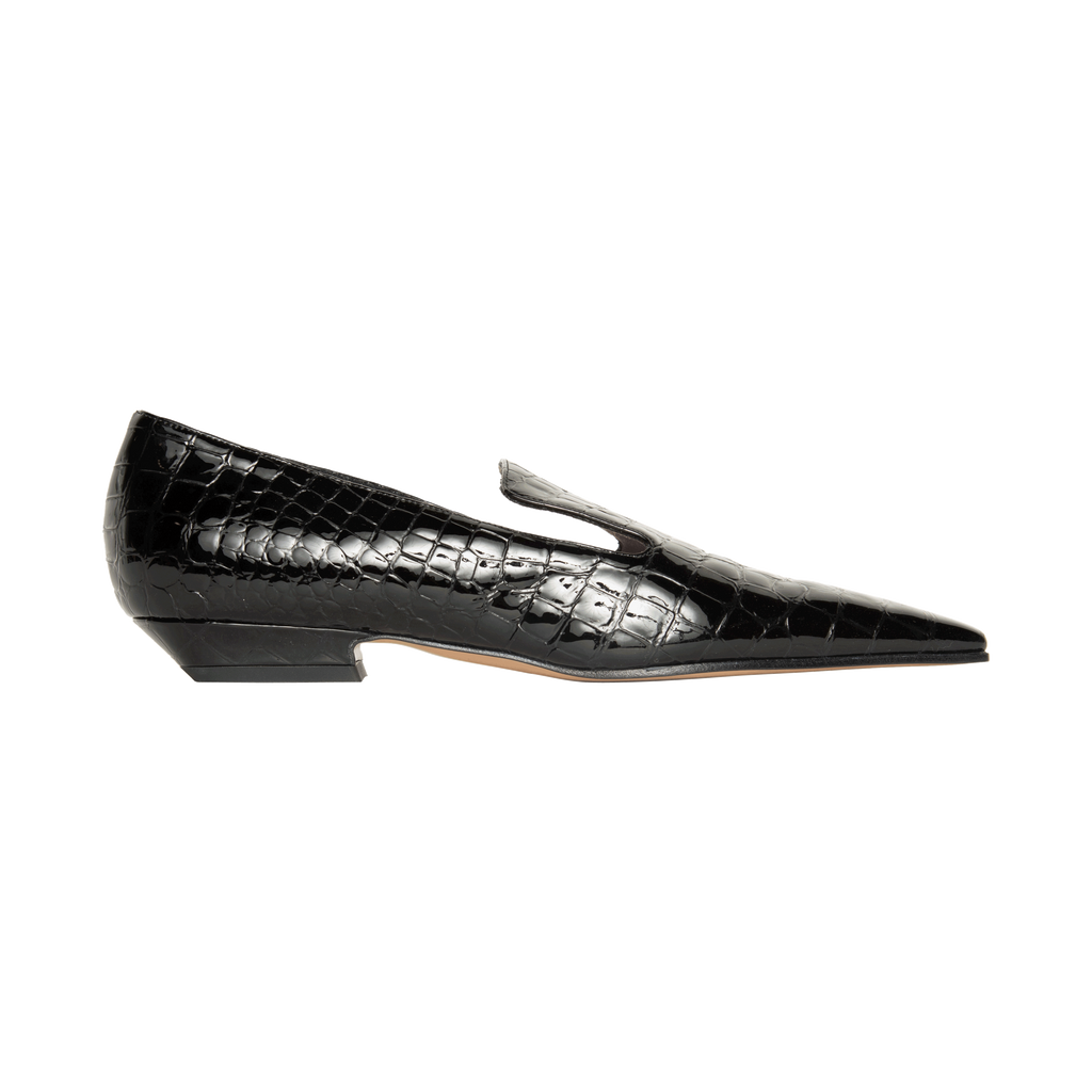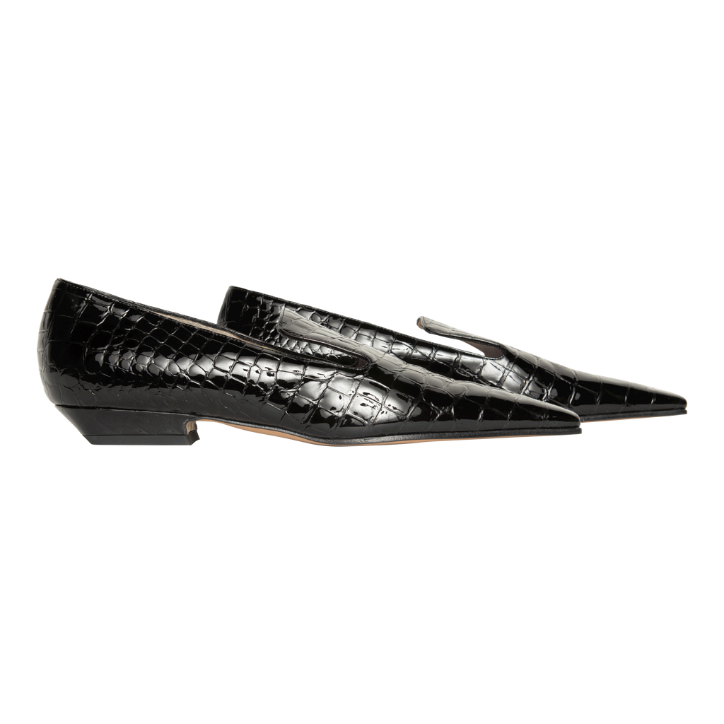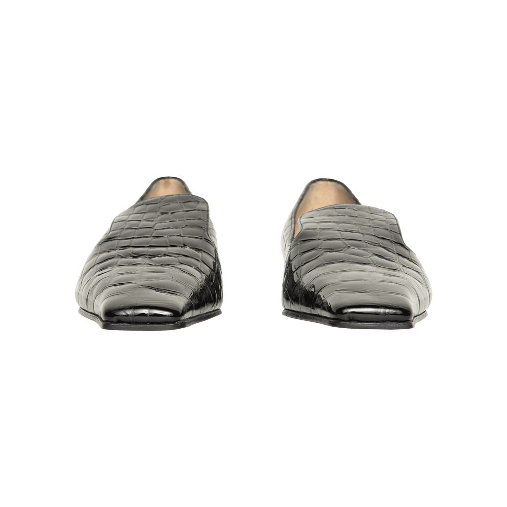 Khaite Marfa Croc Patent-Leather Loafers features narrow square toe.