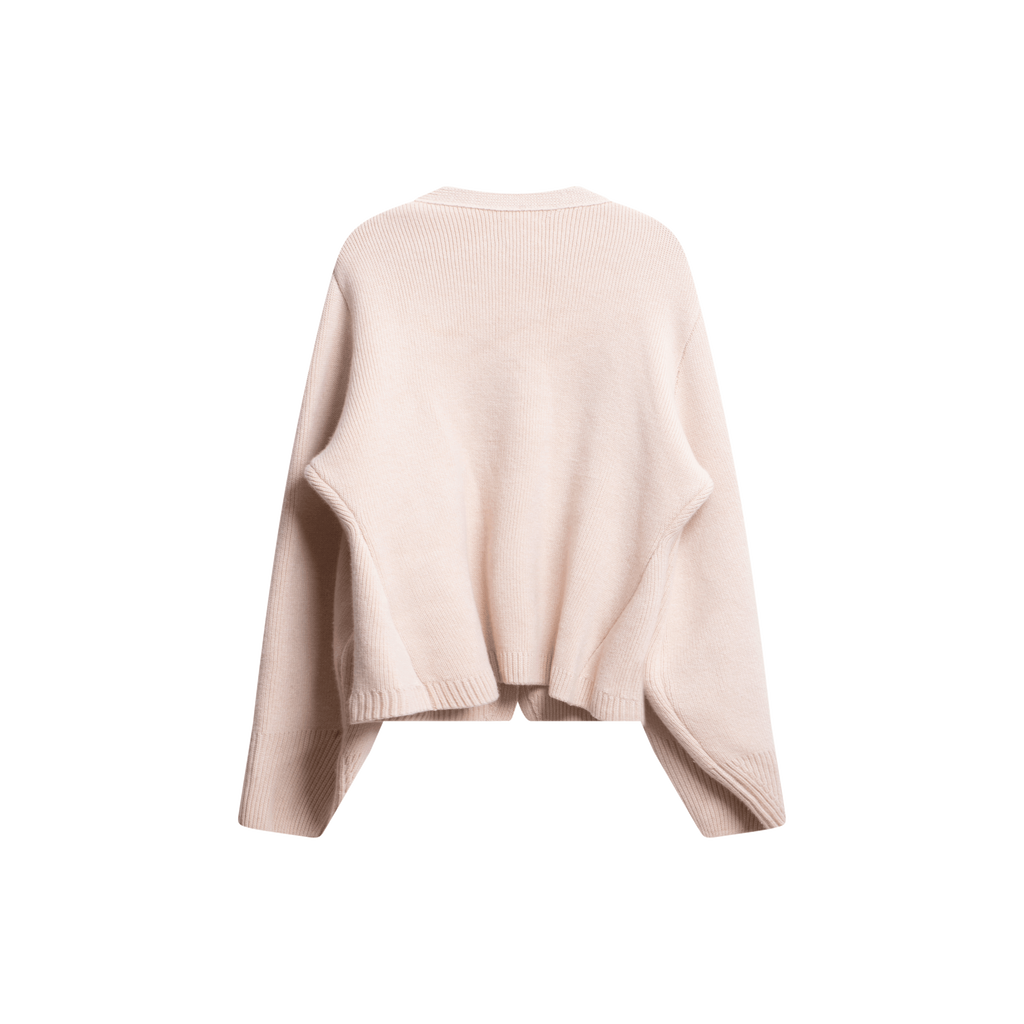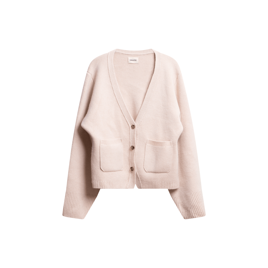 Khaite Scarlet Cashmere Cardigan features three button front, deep V-neckline, hip patch pockets, ribbed hem and cuffs.