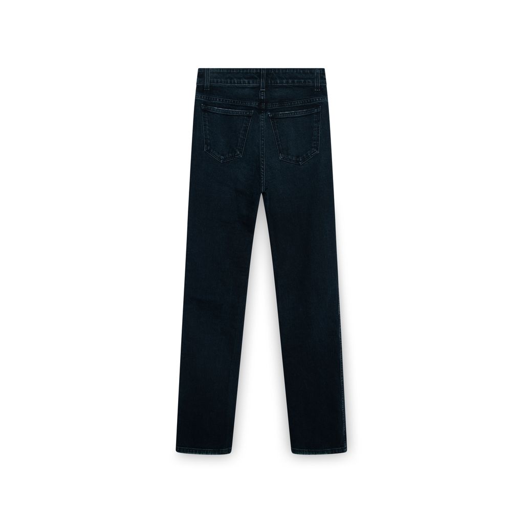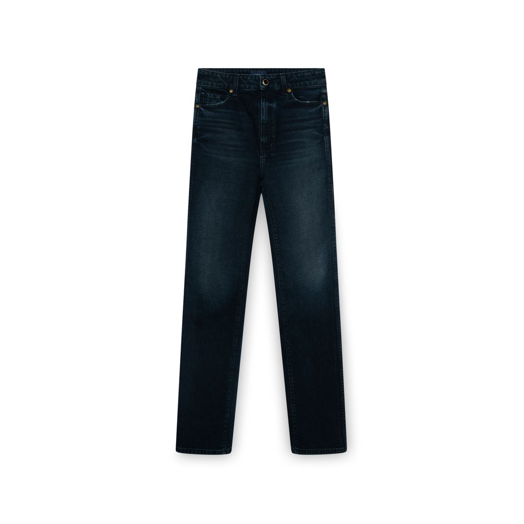 Khaite Straight Leg Jeans features 5 pocket styling, high waist, and antiqued brass button closure.